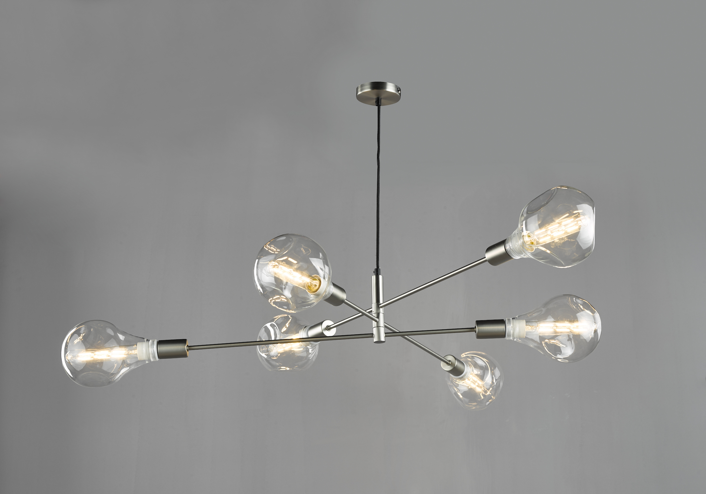 An asymmetric armed pendant in 4 beautiful finishes. A very versatile look that can change dependent on which decorative lamps you choose to style it with.
