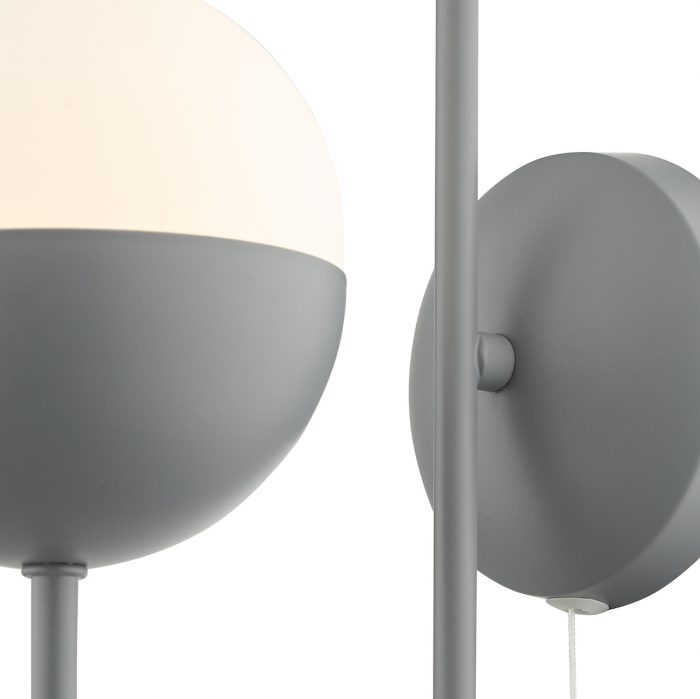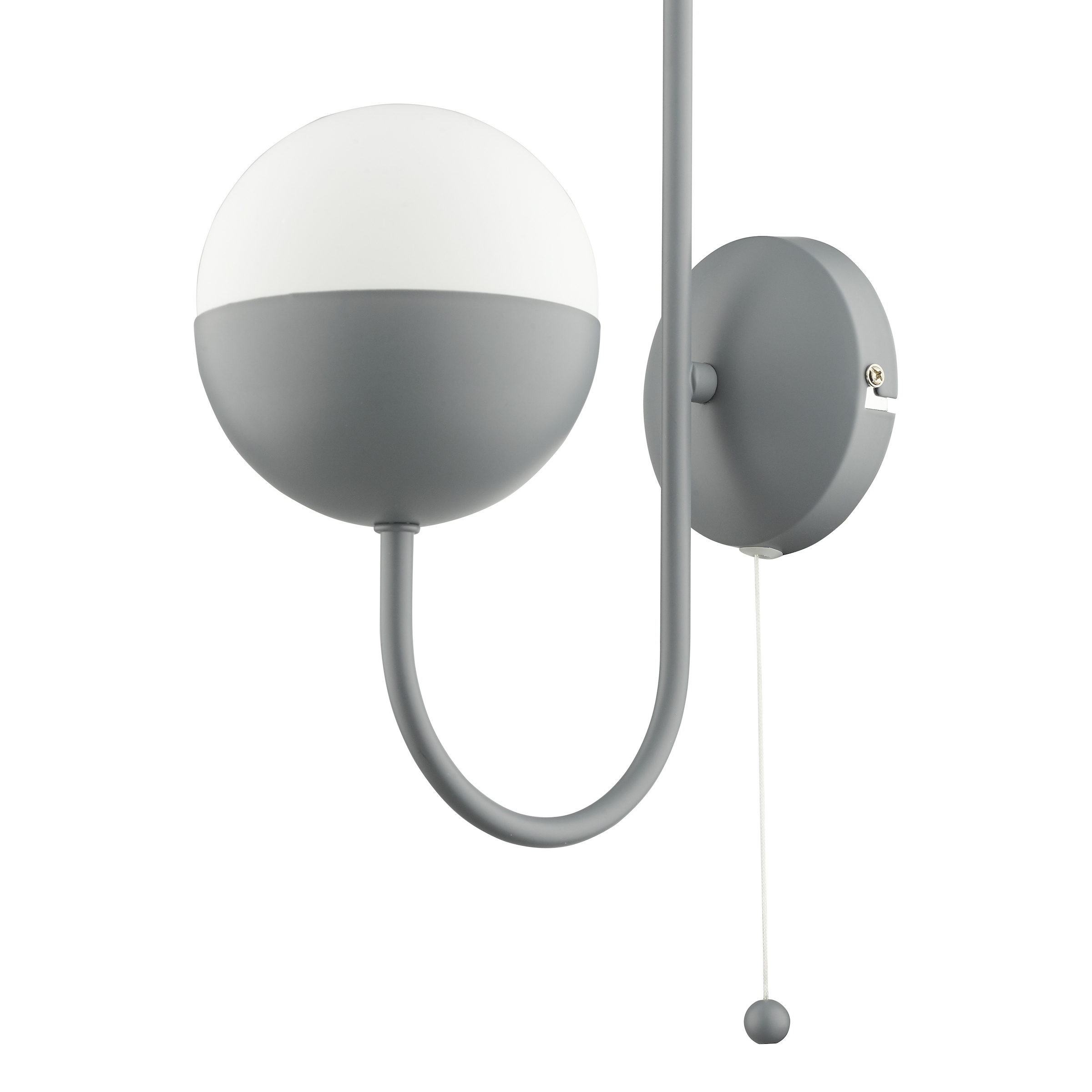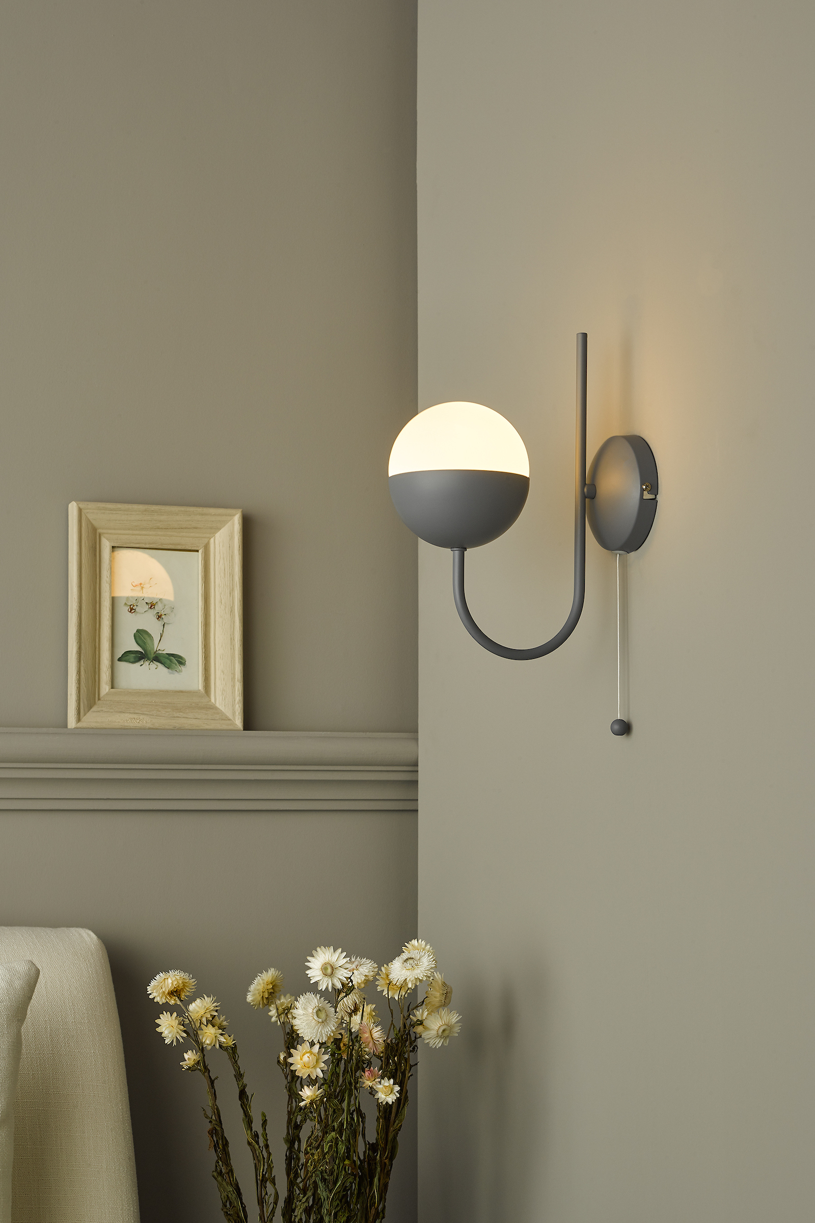 A ball shaped single wall light with an opal glass upper half, with either a powder coated matt grey or an aged brass lower half.