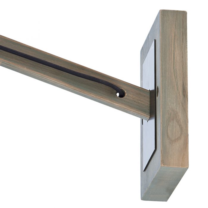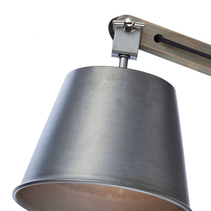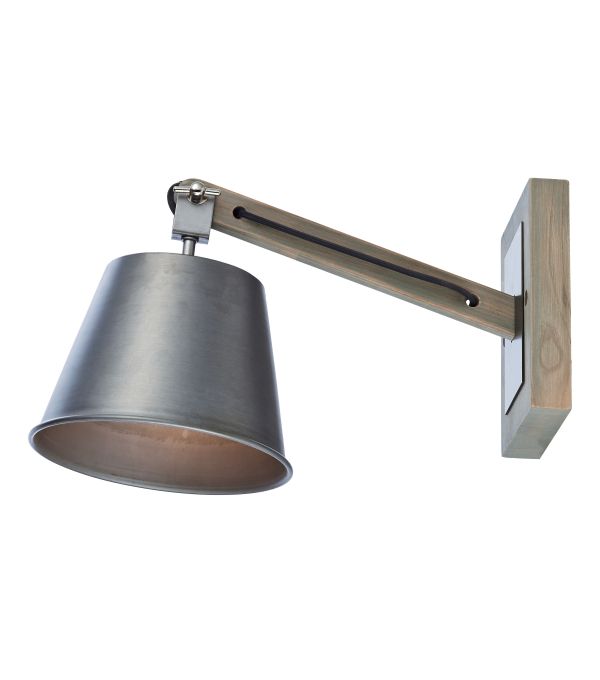 A wall light featuring a wooden backplate and frame, braided cable and a grey metal shade.