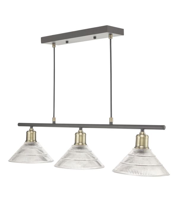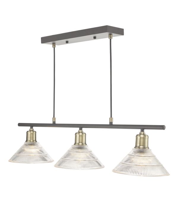 Featuring a prismatic glass shade and antique brass detail, a great look for a soft industrial bar pendant light.