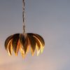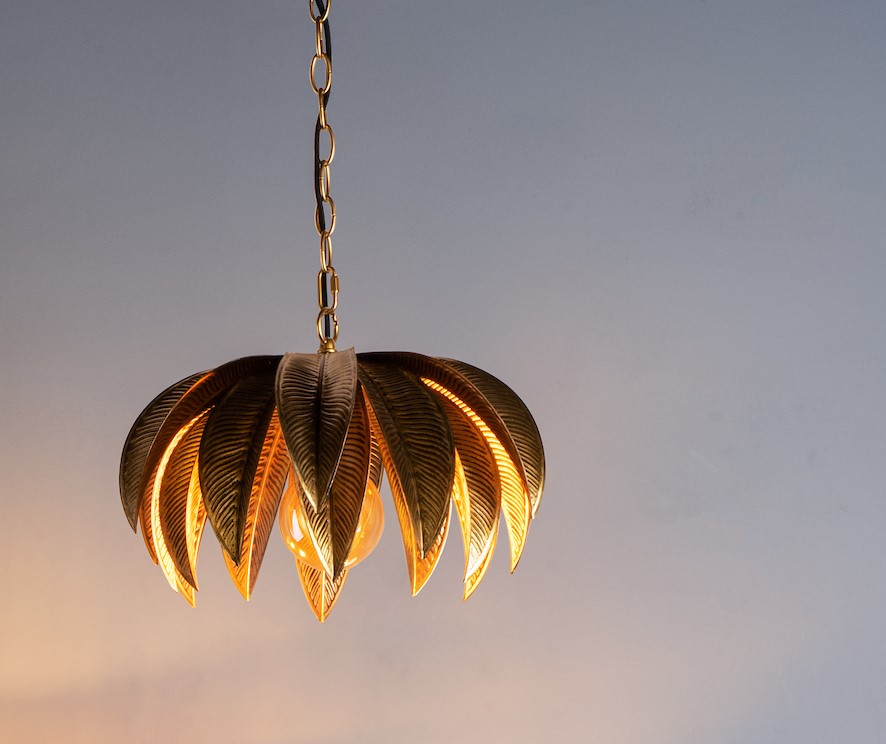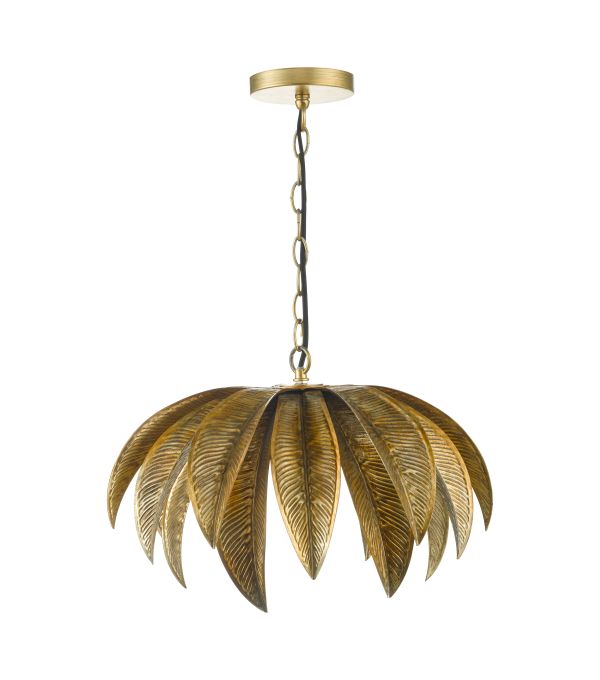 Glamourous palm leaf style pendant light in an antique gold finish. Featuring long metal leaves enveloping a central bulb to create the look of a palm tree.