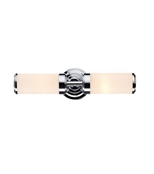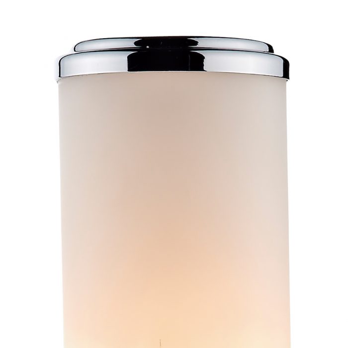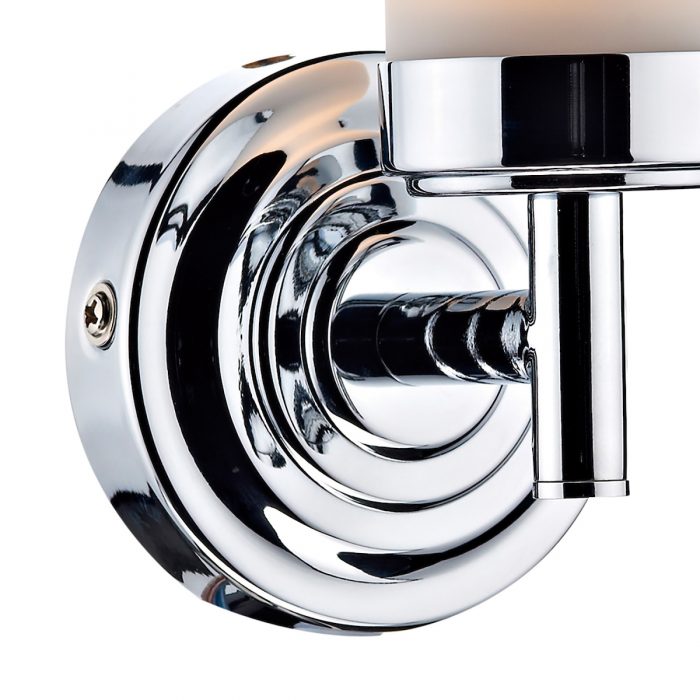 This wall light has a ribbed polished chrome backplate and frosted glass shade.