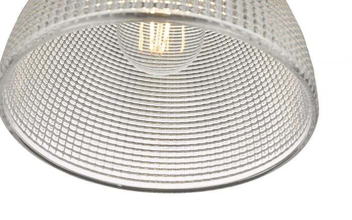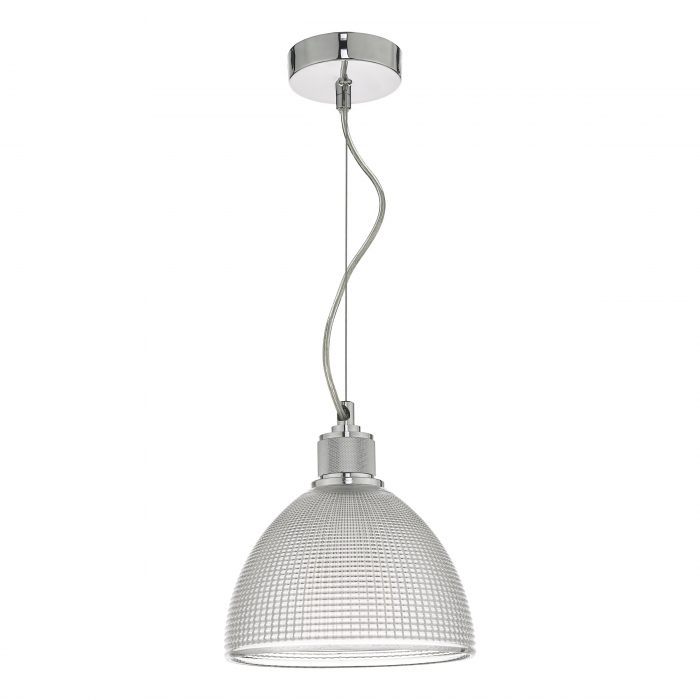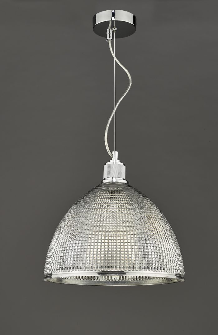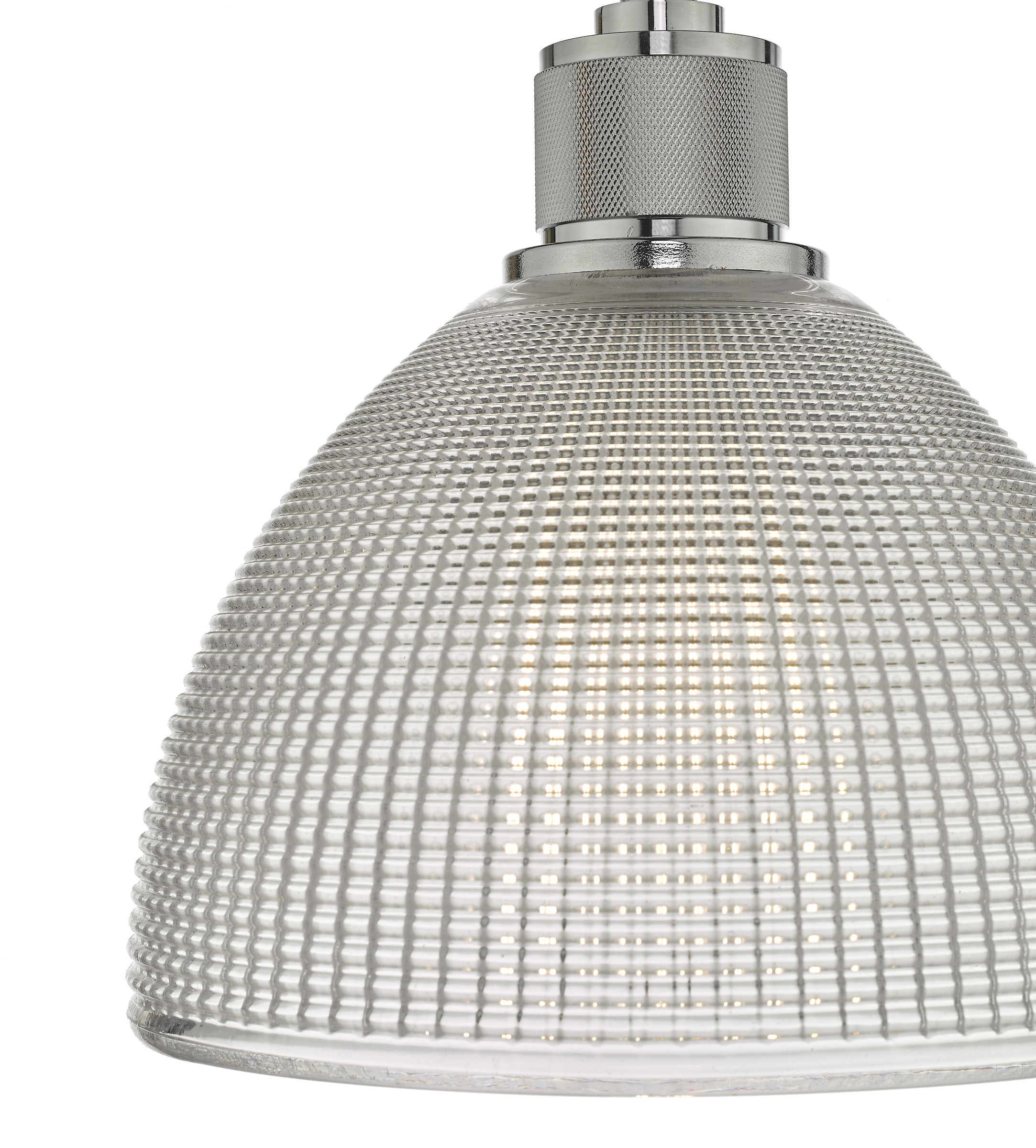 Simple prismatic glass pendant with polished chrome detailing that illuminates any space perfectly.