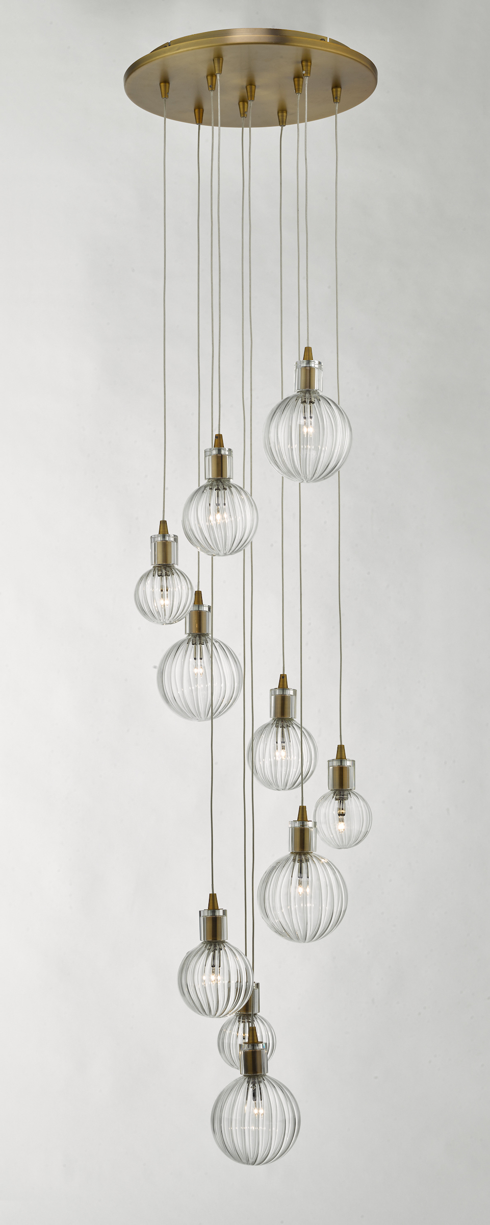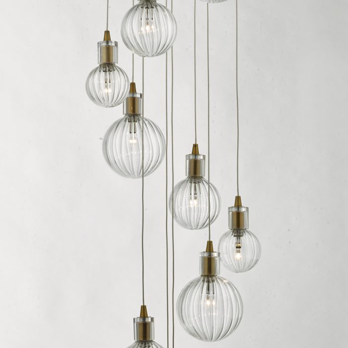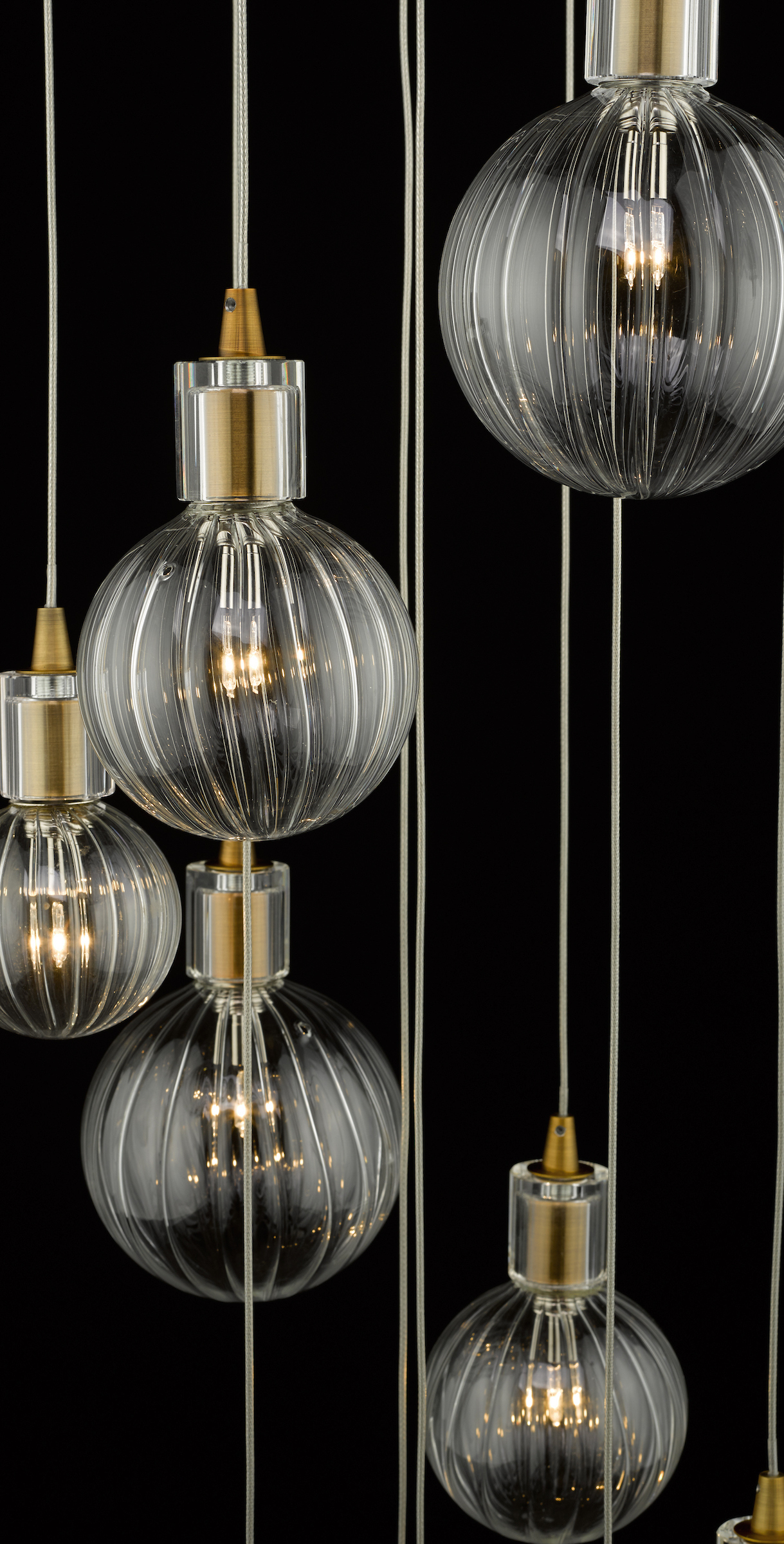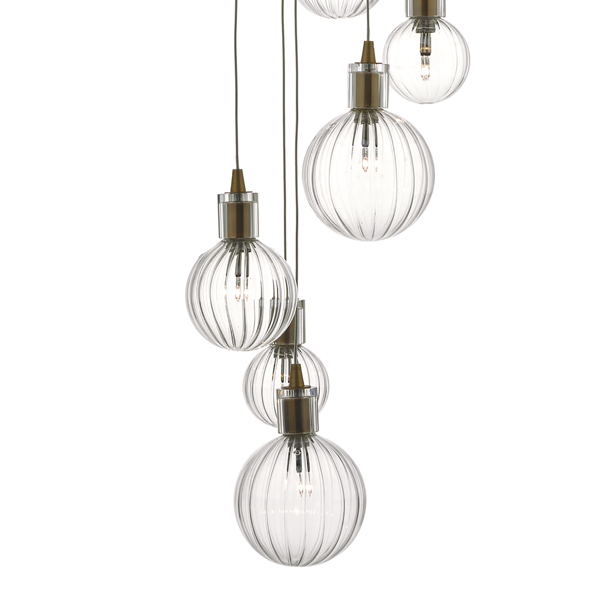 Featuring a warm brass finish with an assortment of ribbed glass shades at various lengths.