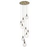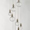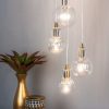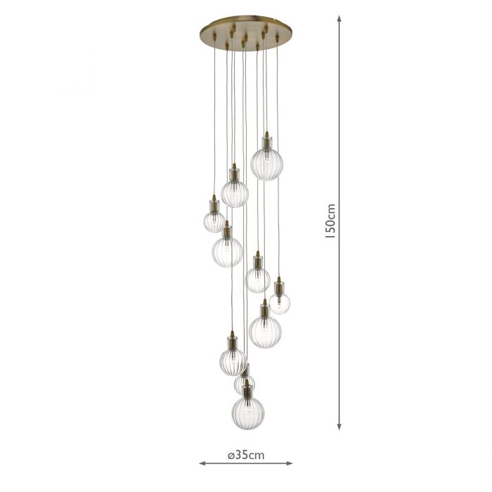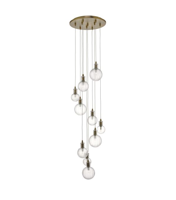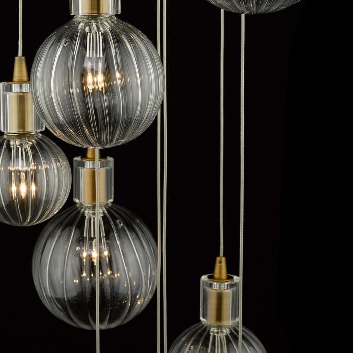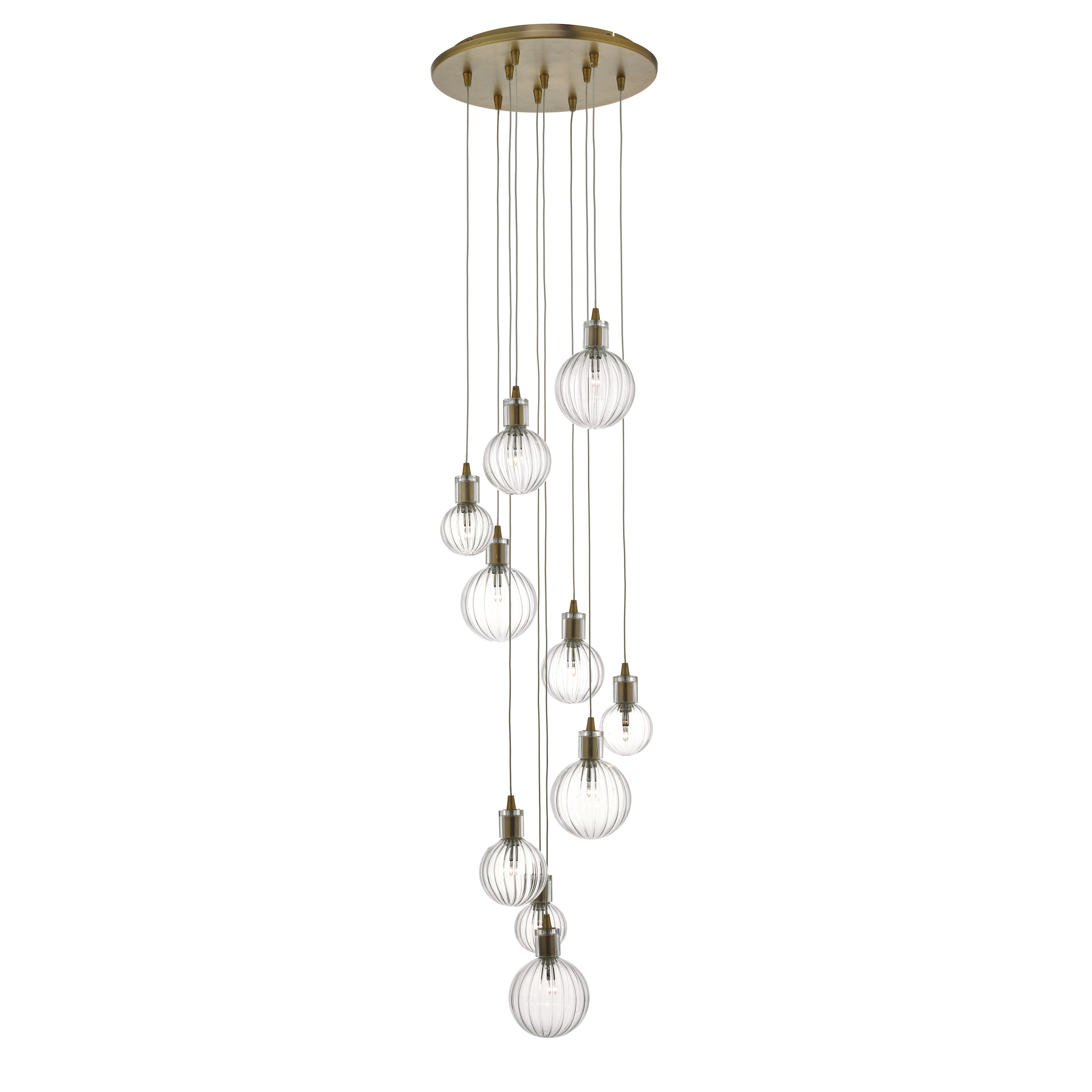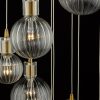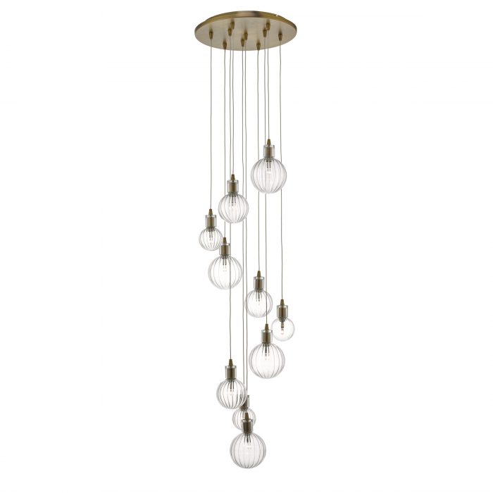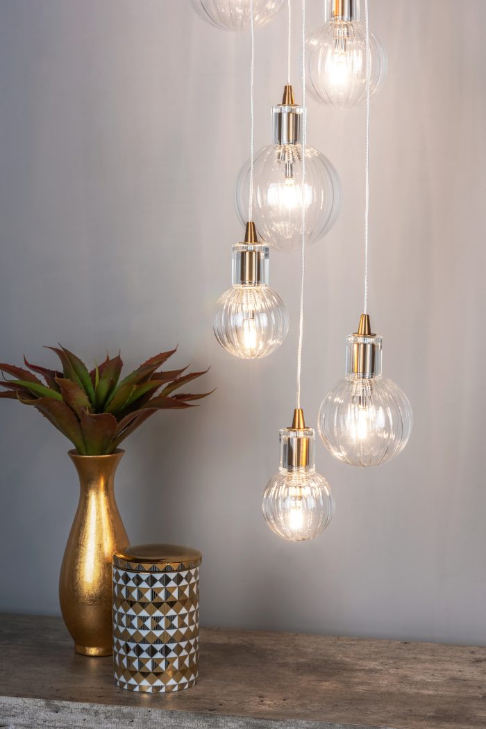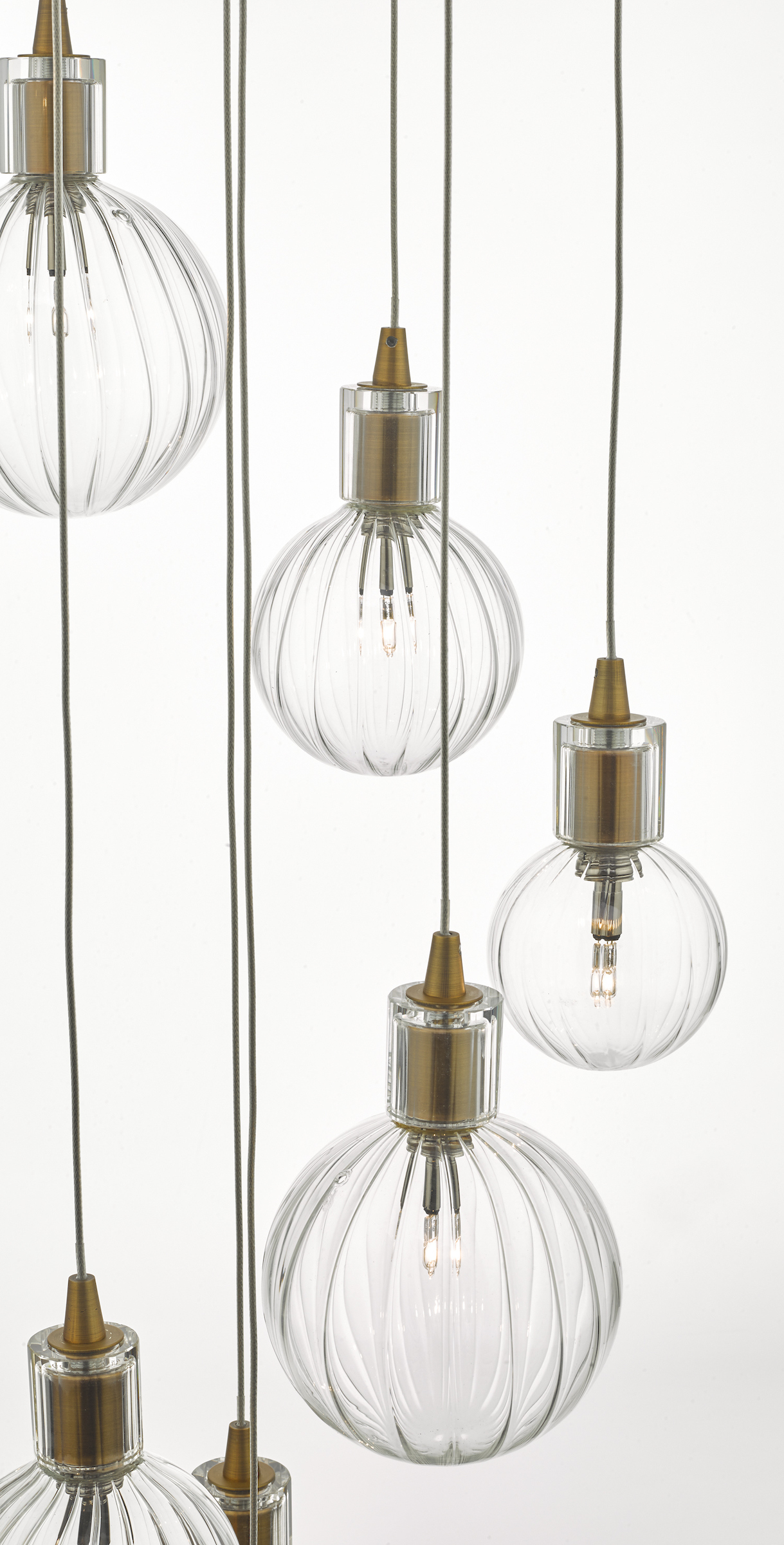 Featuring a warm brass finish with an assortment of ribbed glass shades at various lengths.
