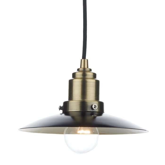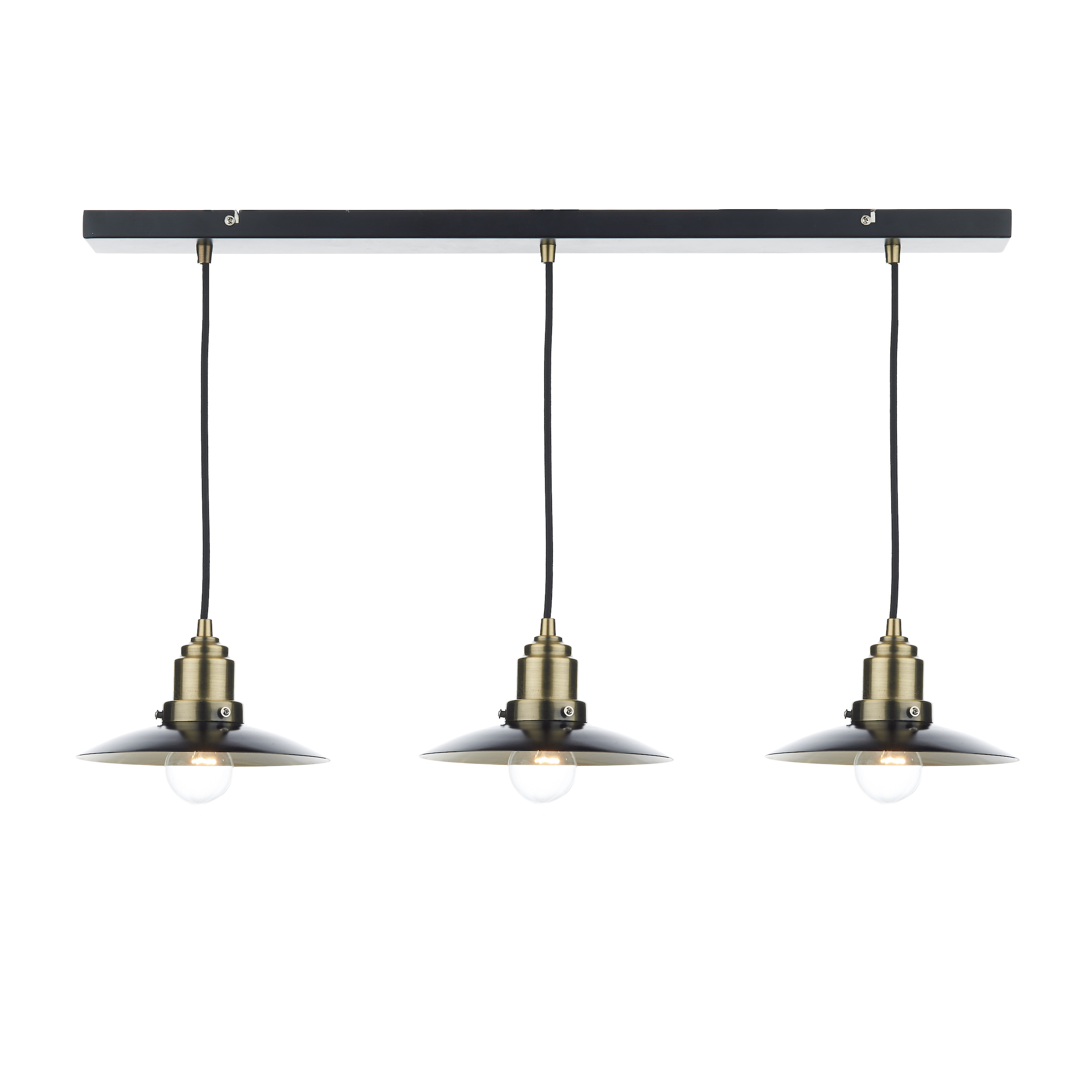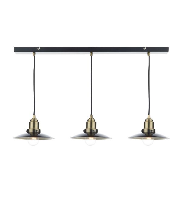 A 3 light bar pendant in a two tone retro style in a black & antique brass finish.