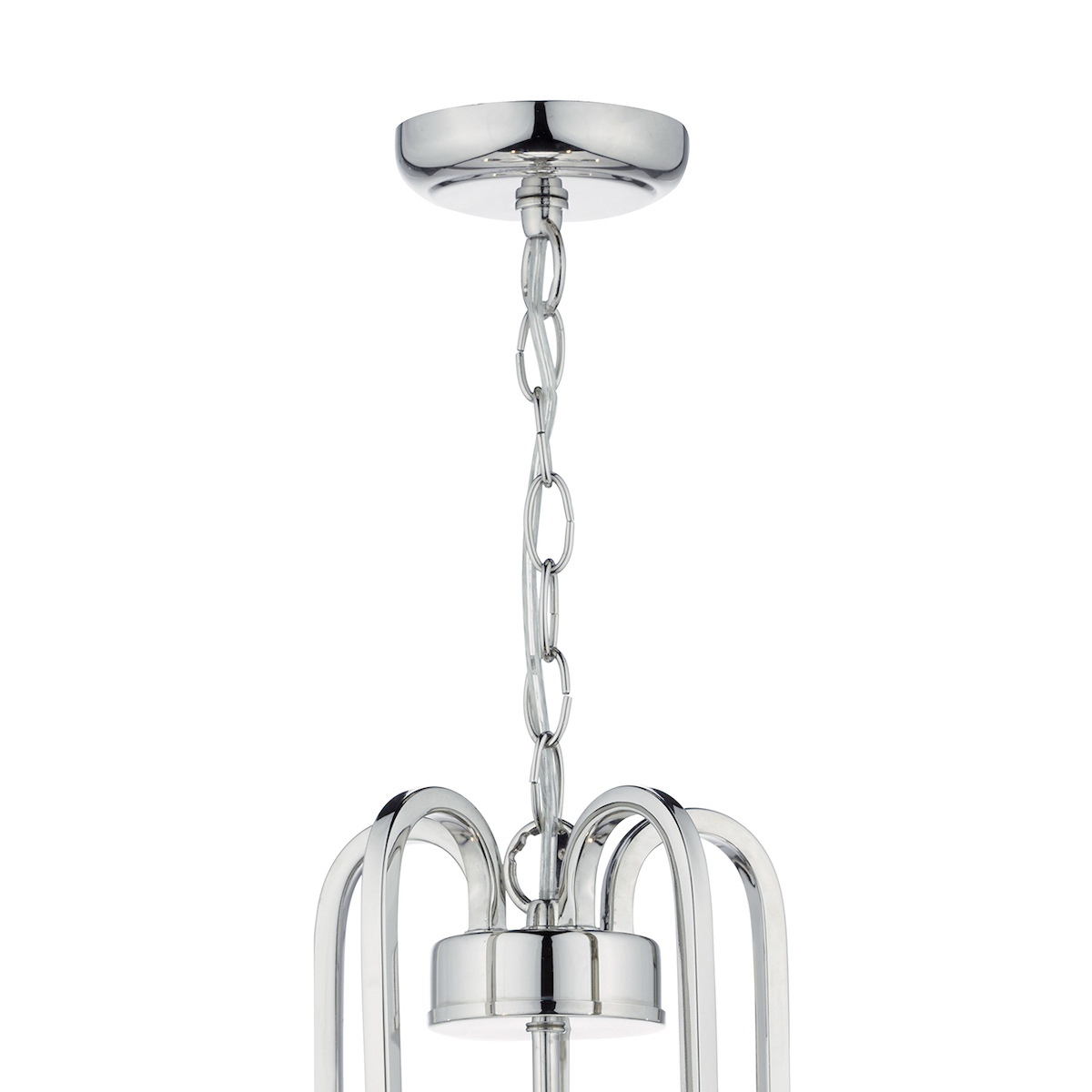 A contemporary twist on the classic chandelier, finished in polished nickel.