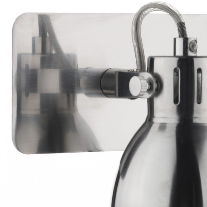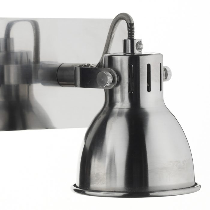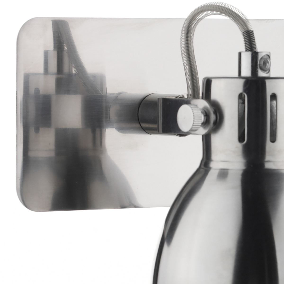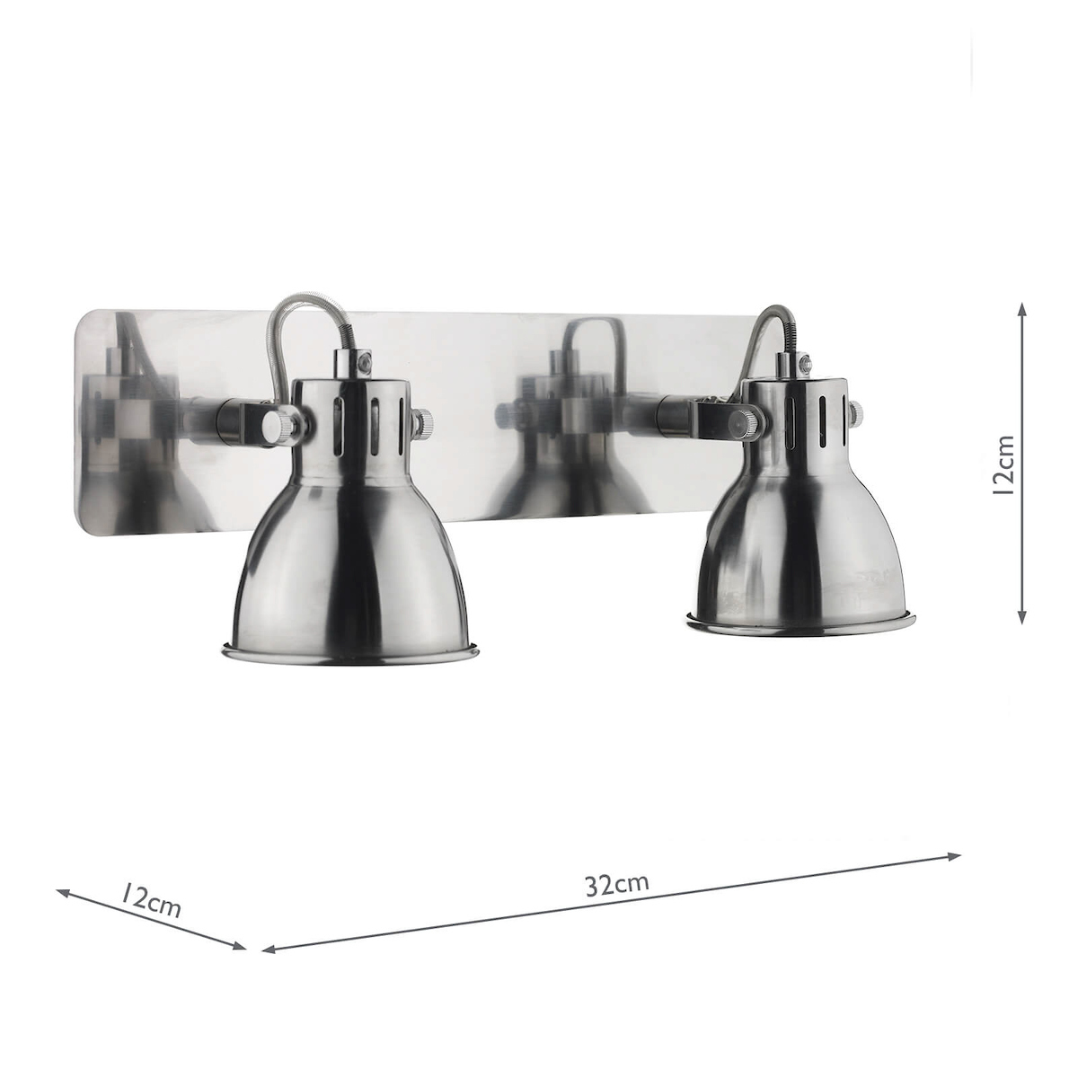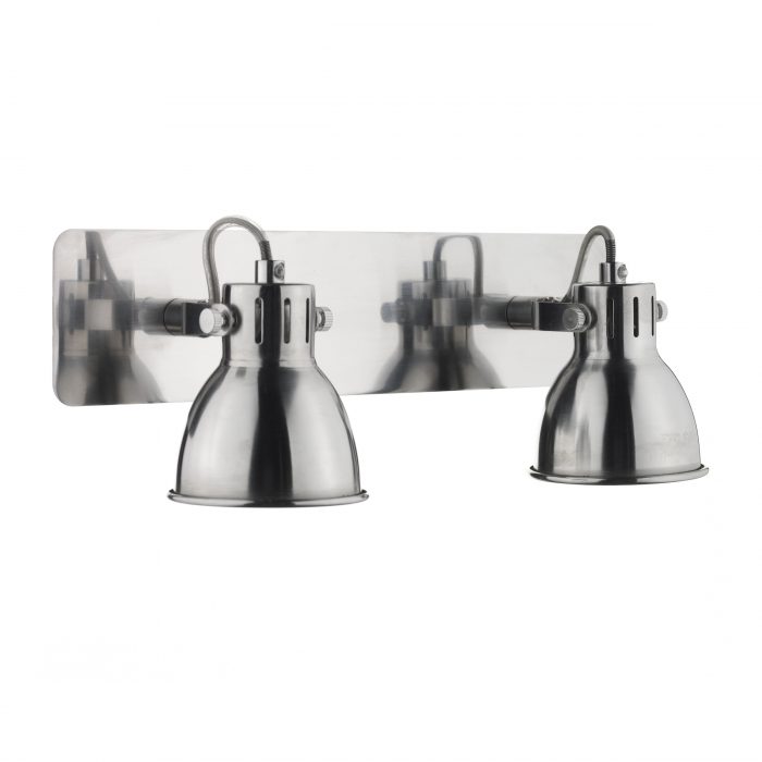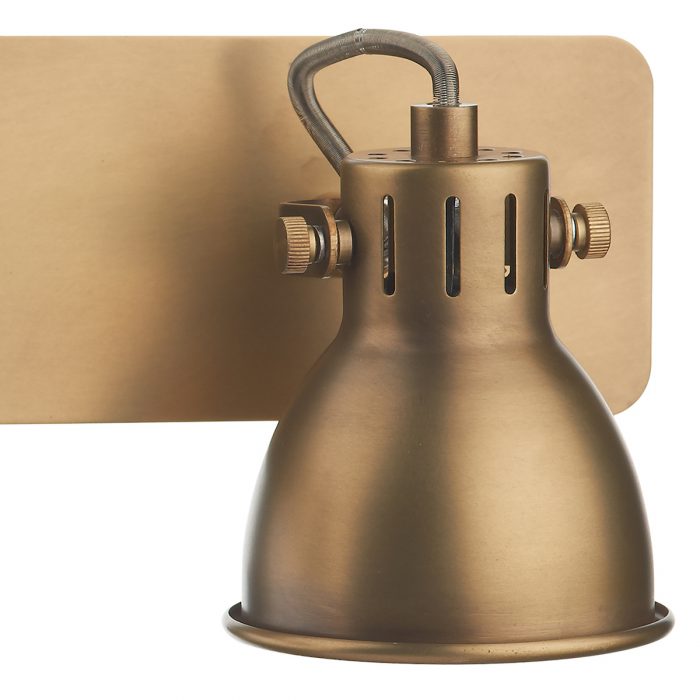 A 2 light wall spotlight featuring a natural brass plate and movable spots. The wall light is rocker switched.