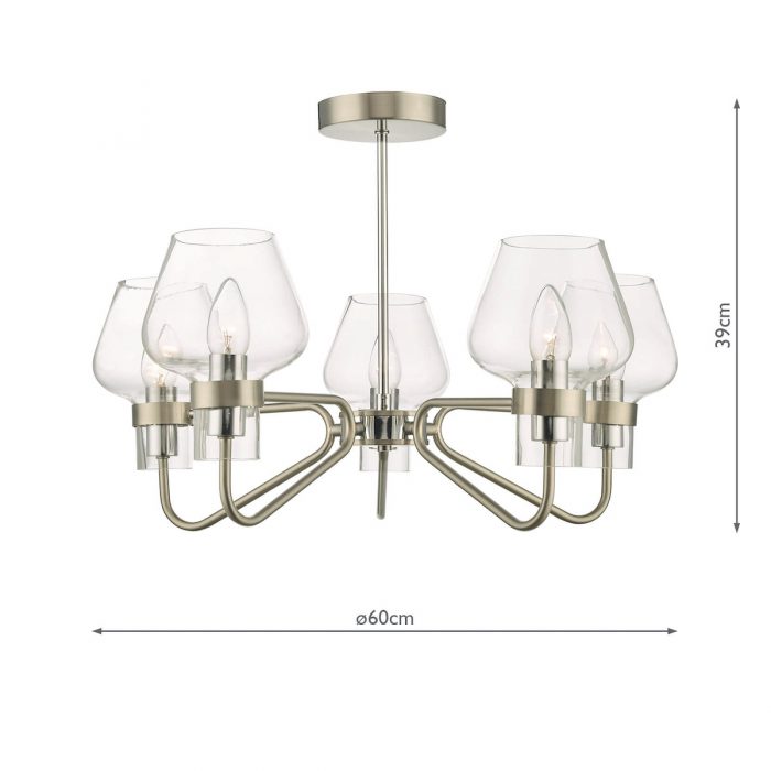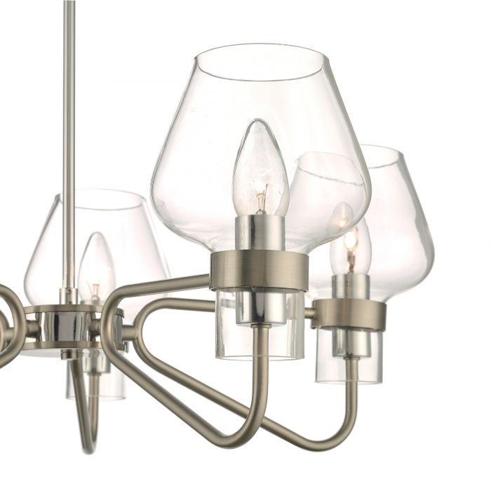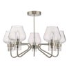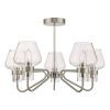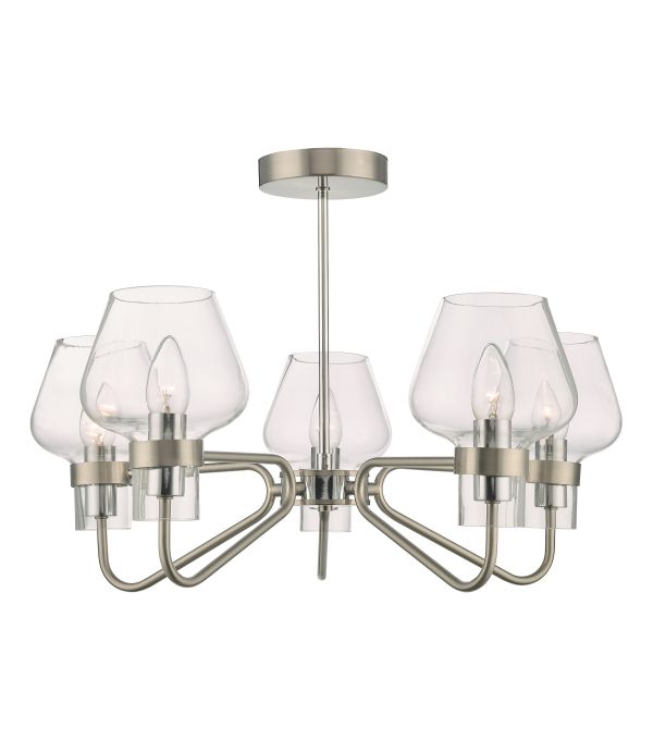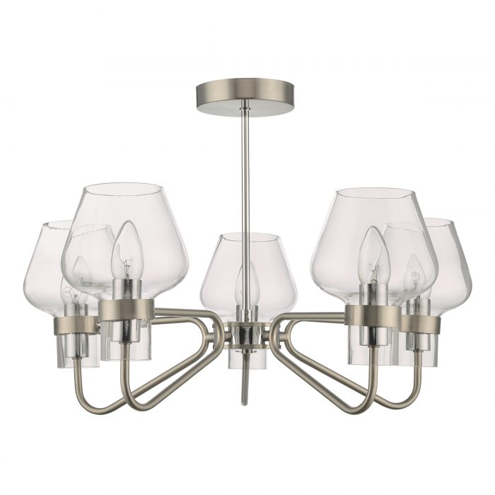 A semi flush ceiling light featuring glass shades with a retro look resting on a complementary satin chrome frame.
