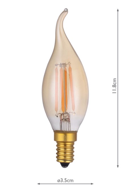 Dimmable LED Vintage Flame Tip Candle Light Bulb (Lamp) SES/E14; 4W; 250 Lumens; 1800k Very Warm White; Amber Glass