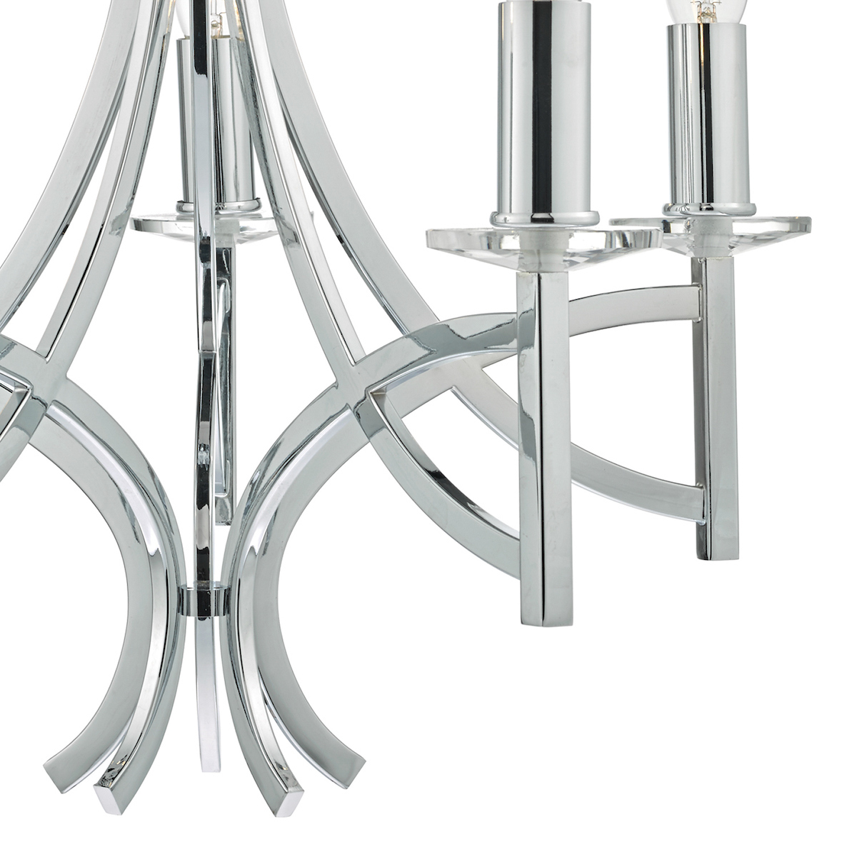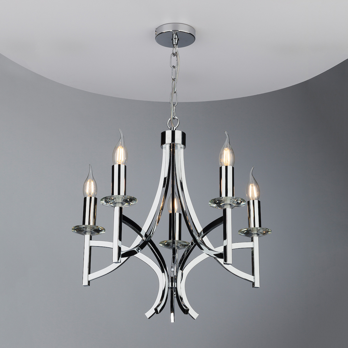 A 5 light armed pendant with 5 faceted crystal bobeches sitting atop sweeping & intersecting arms to create this modern take on a classic chandelier.