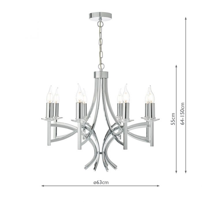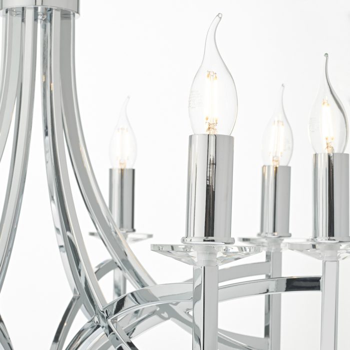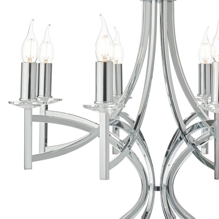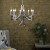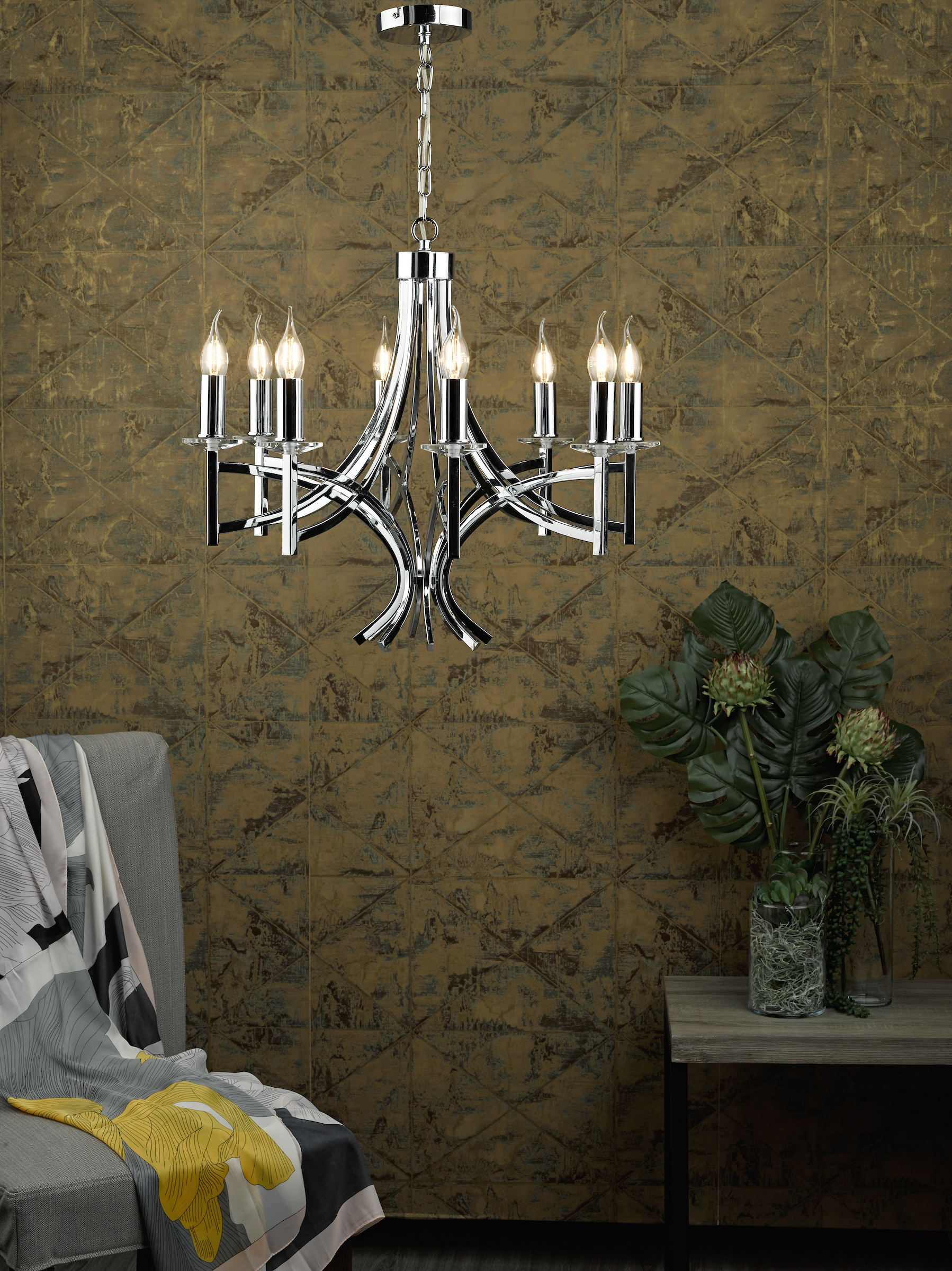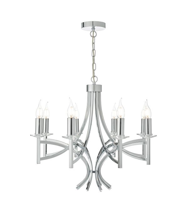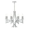 A 8 light armed pendant with 8 faceted crystal bobeches sitting atop sweeping & intersecting arms to create this modern take on a classic chandelier.