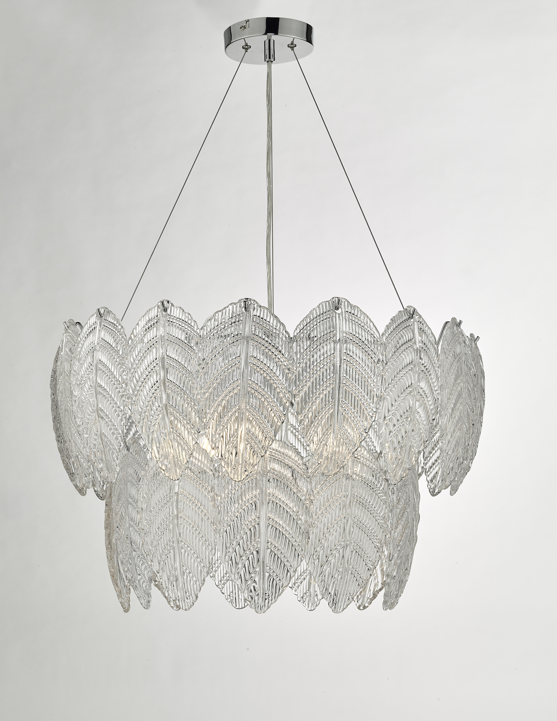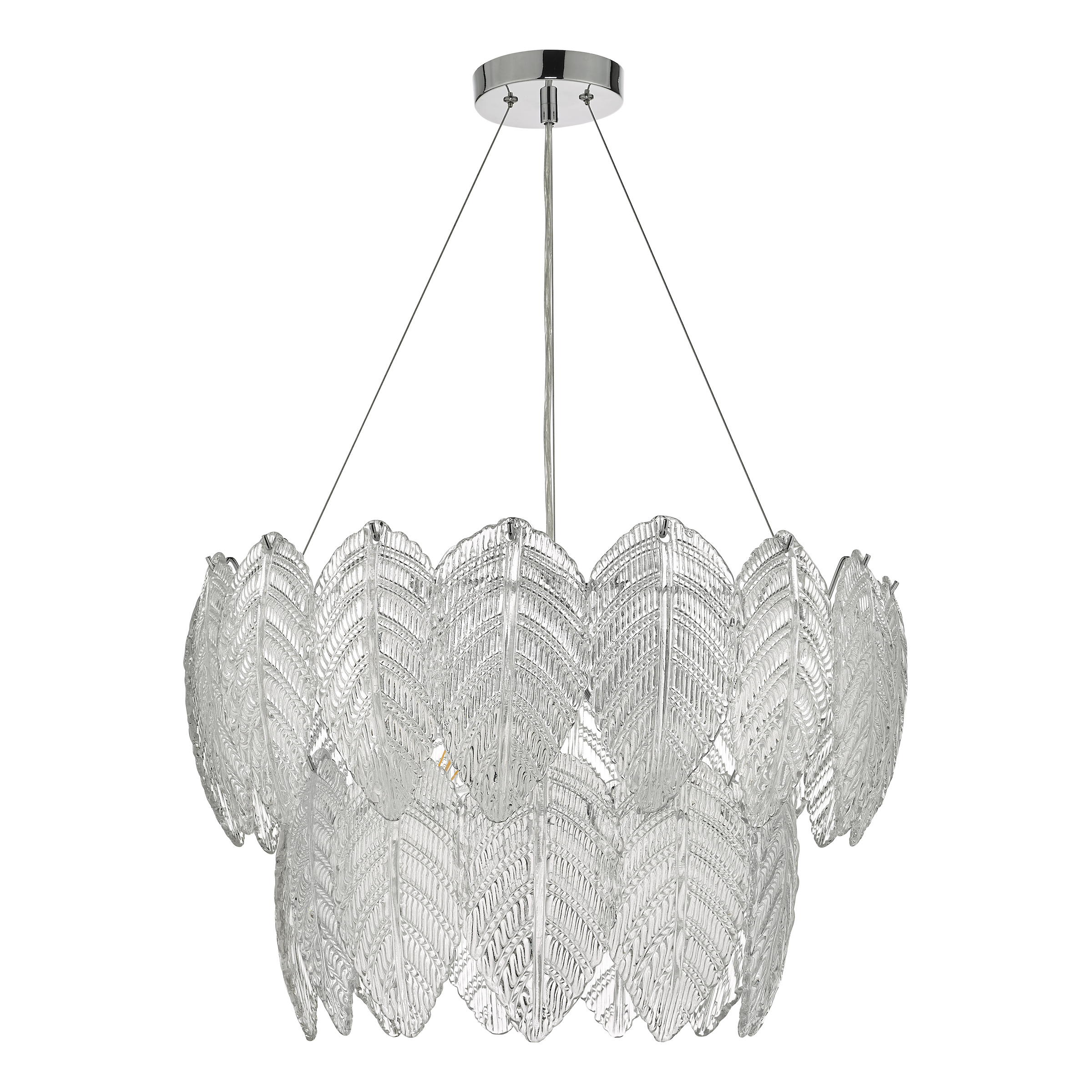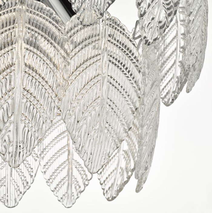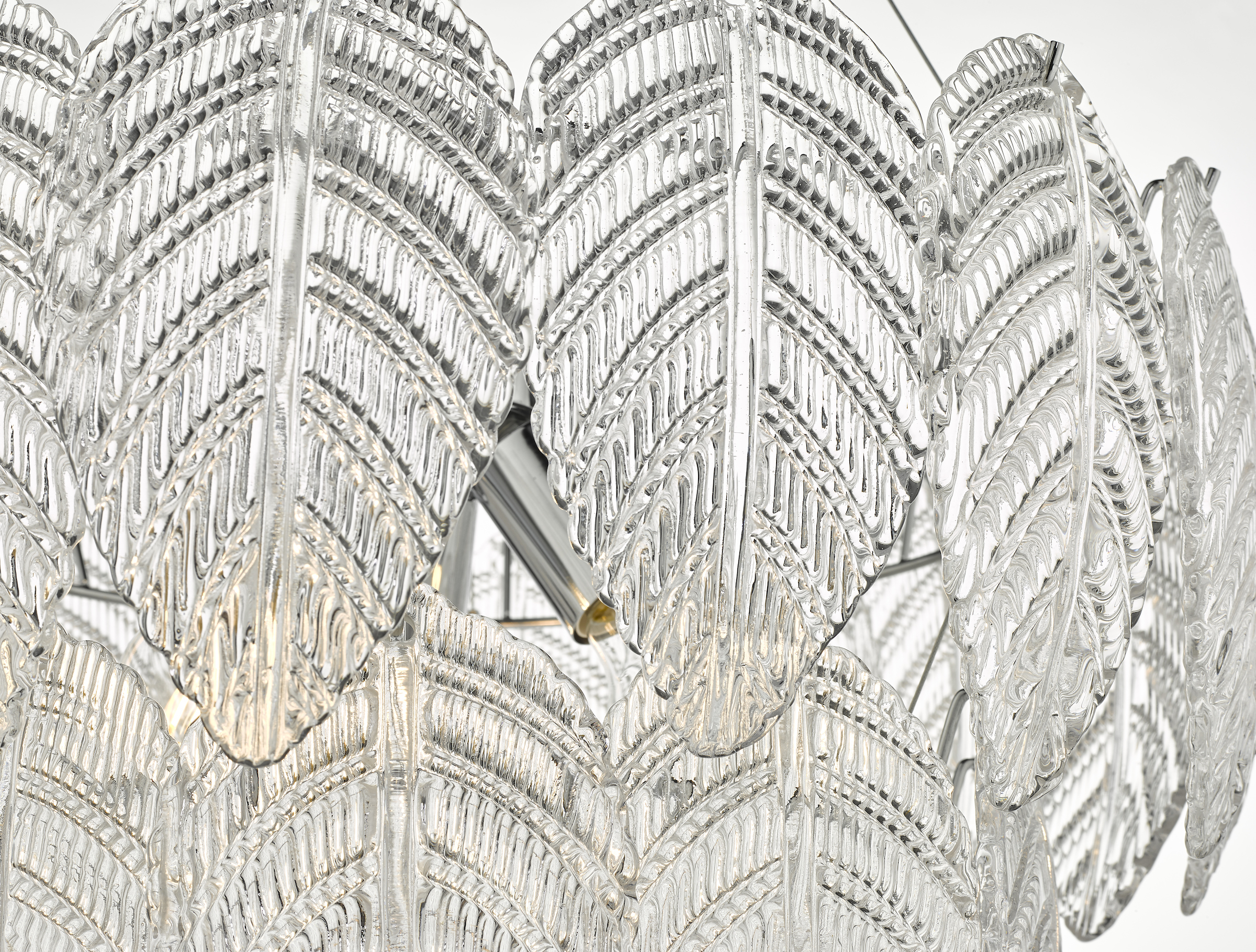 Dozens of pressed glass petals suspended from a polished chrome ring to form a beautiful artichoke style pendant.