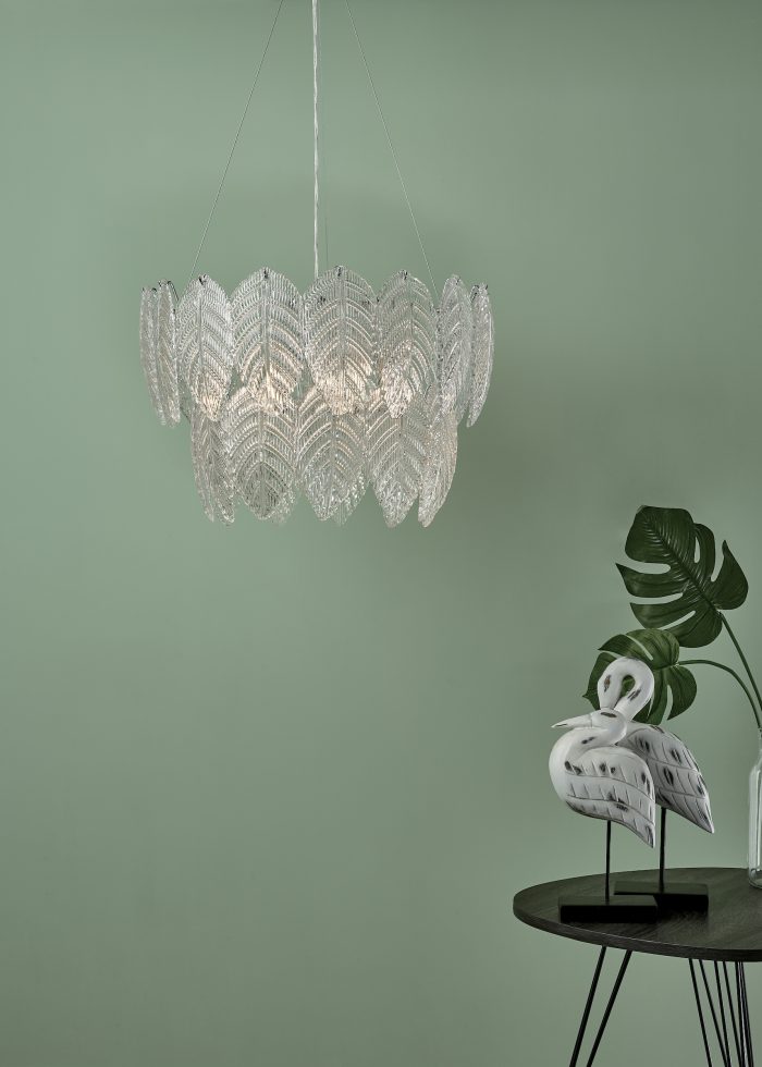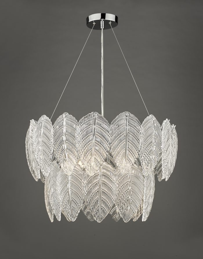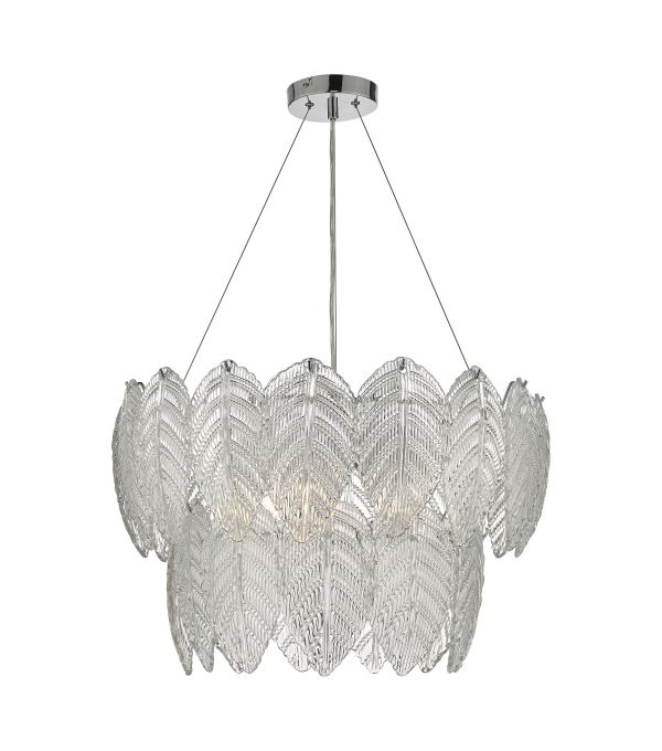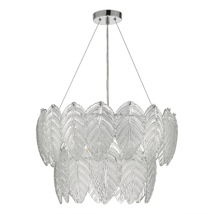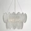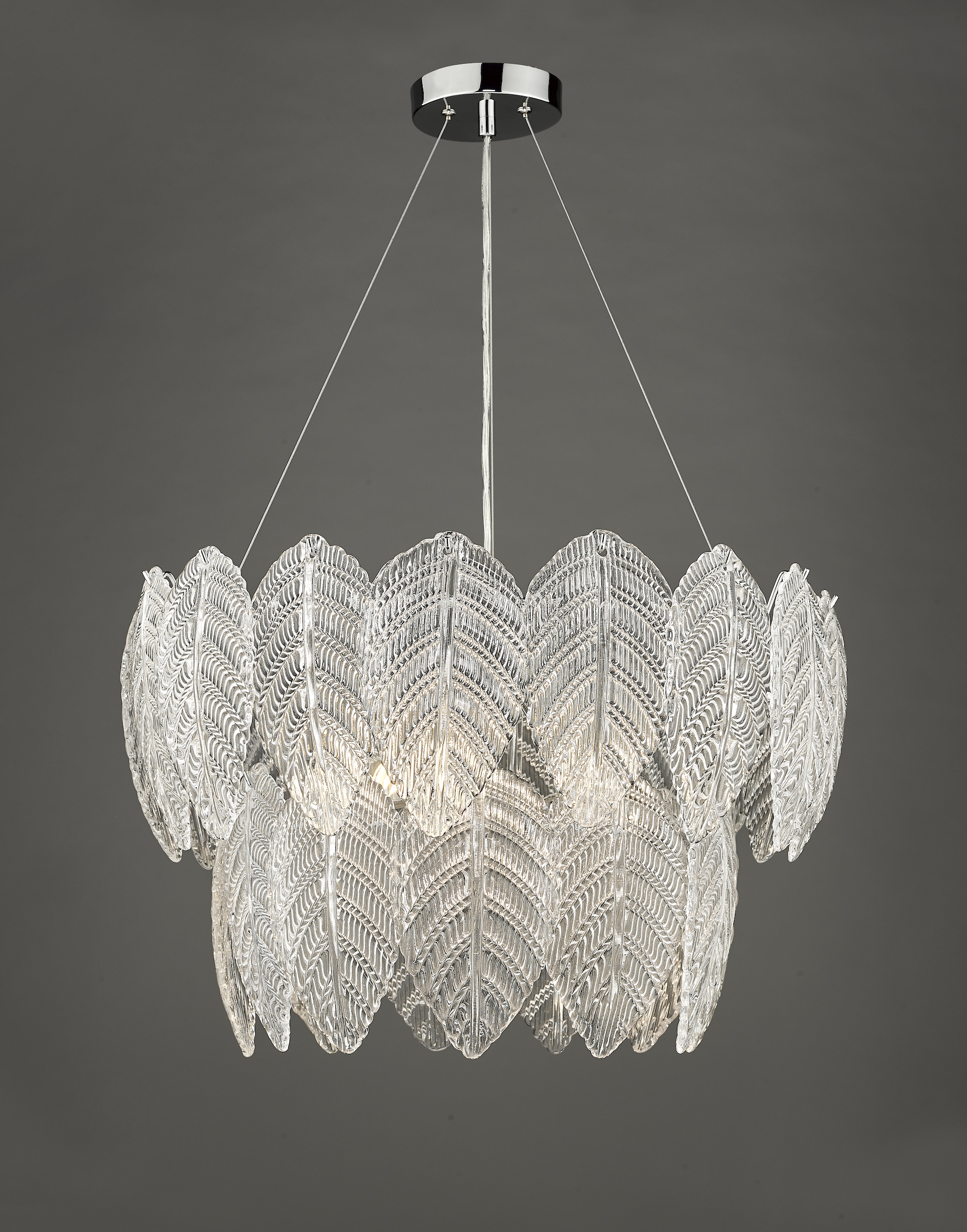 Dozens of pressed glass petals suspended from a polished chrome ring to form a beautiful artichoke style pendant.
