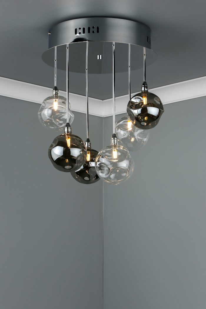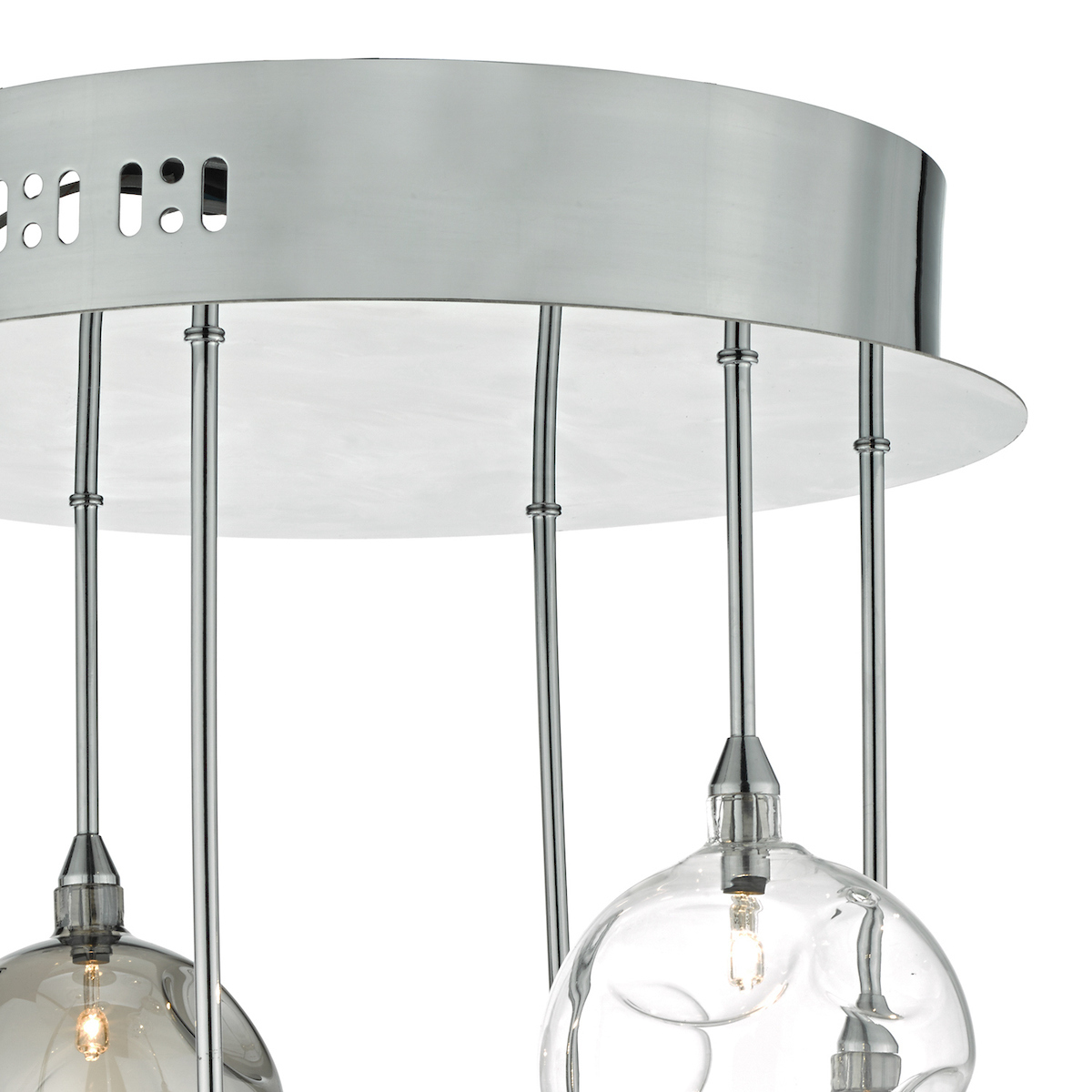 A six light semi flush pendant with organically shaped, mouth-blown glass shades with oversized dimples. In a clear & smoked finish, suspended in a cluster of fixed stems from a fixed ceiling plate.