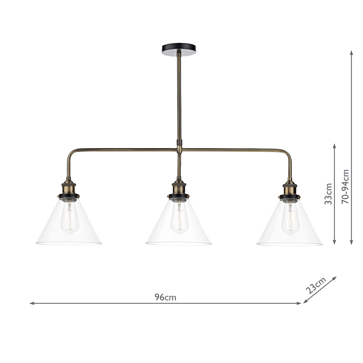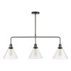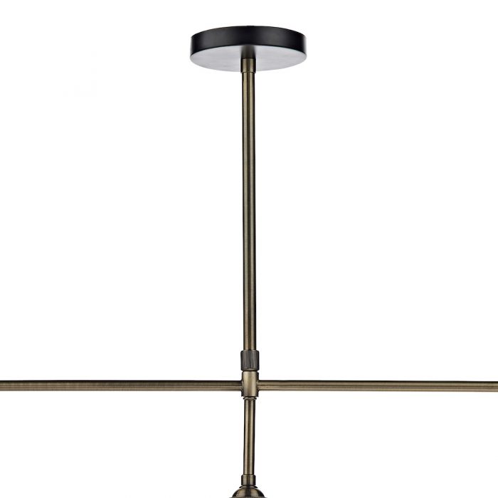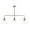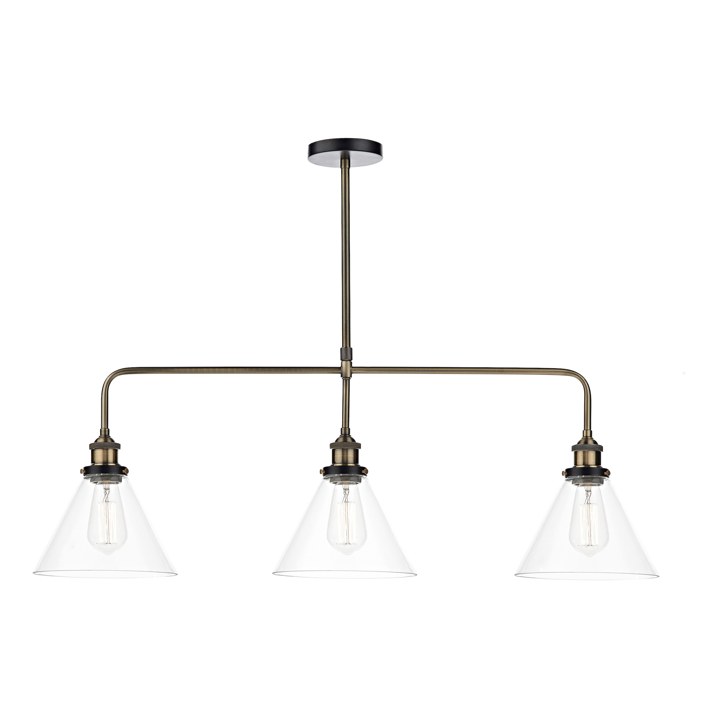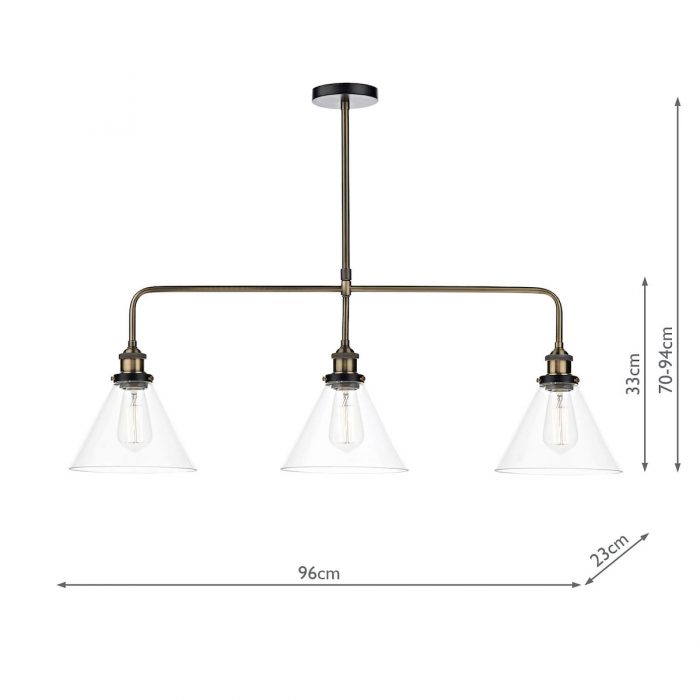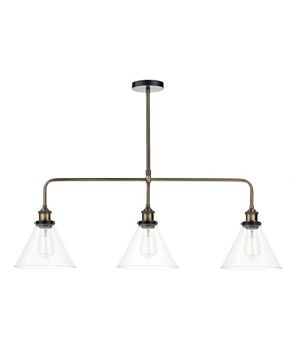 A 3 light bar pendant finished in either antique brass or antique nickel & glass shades.