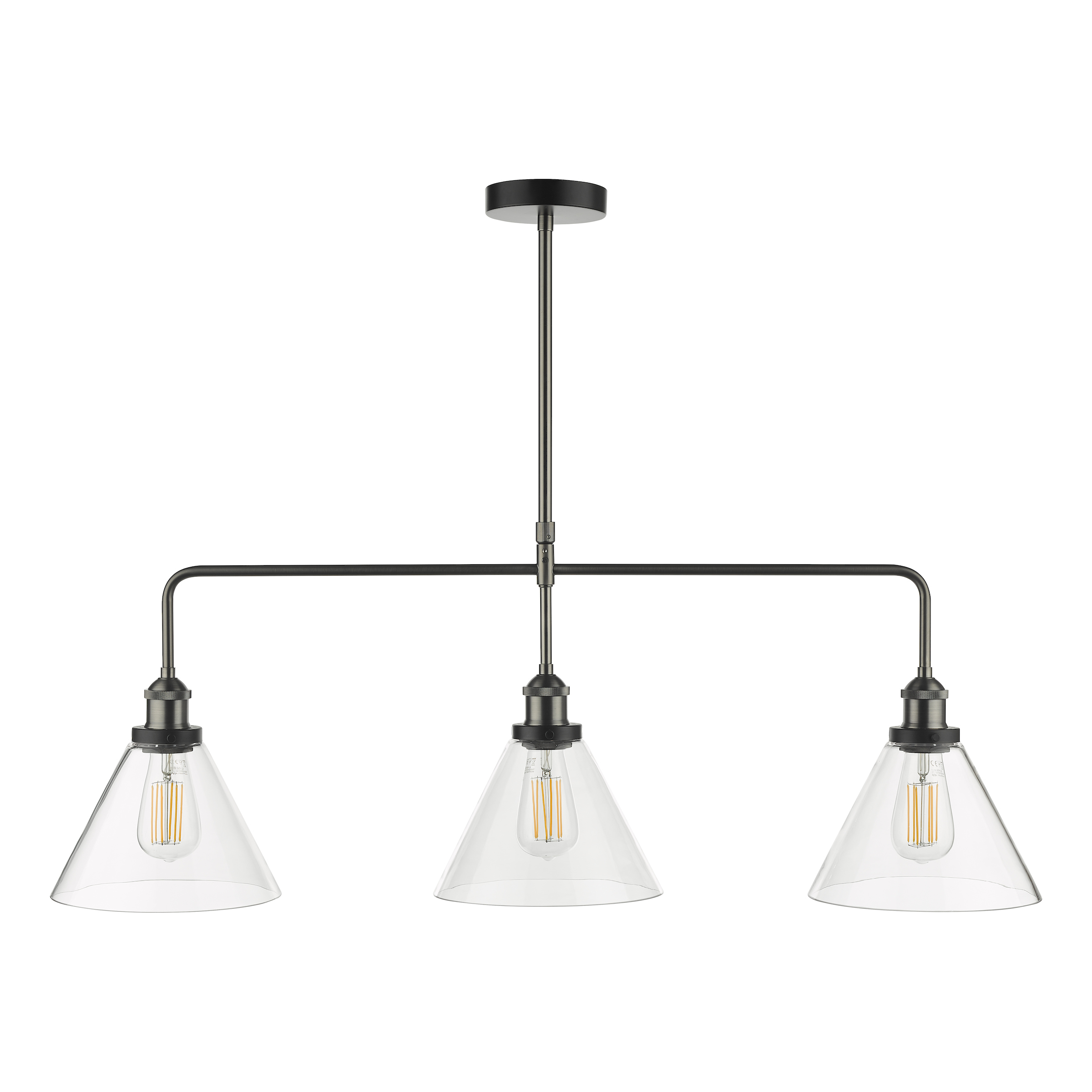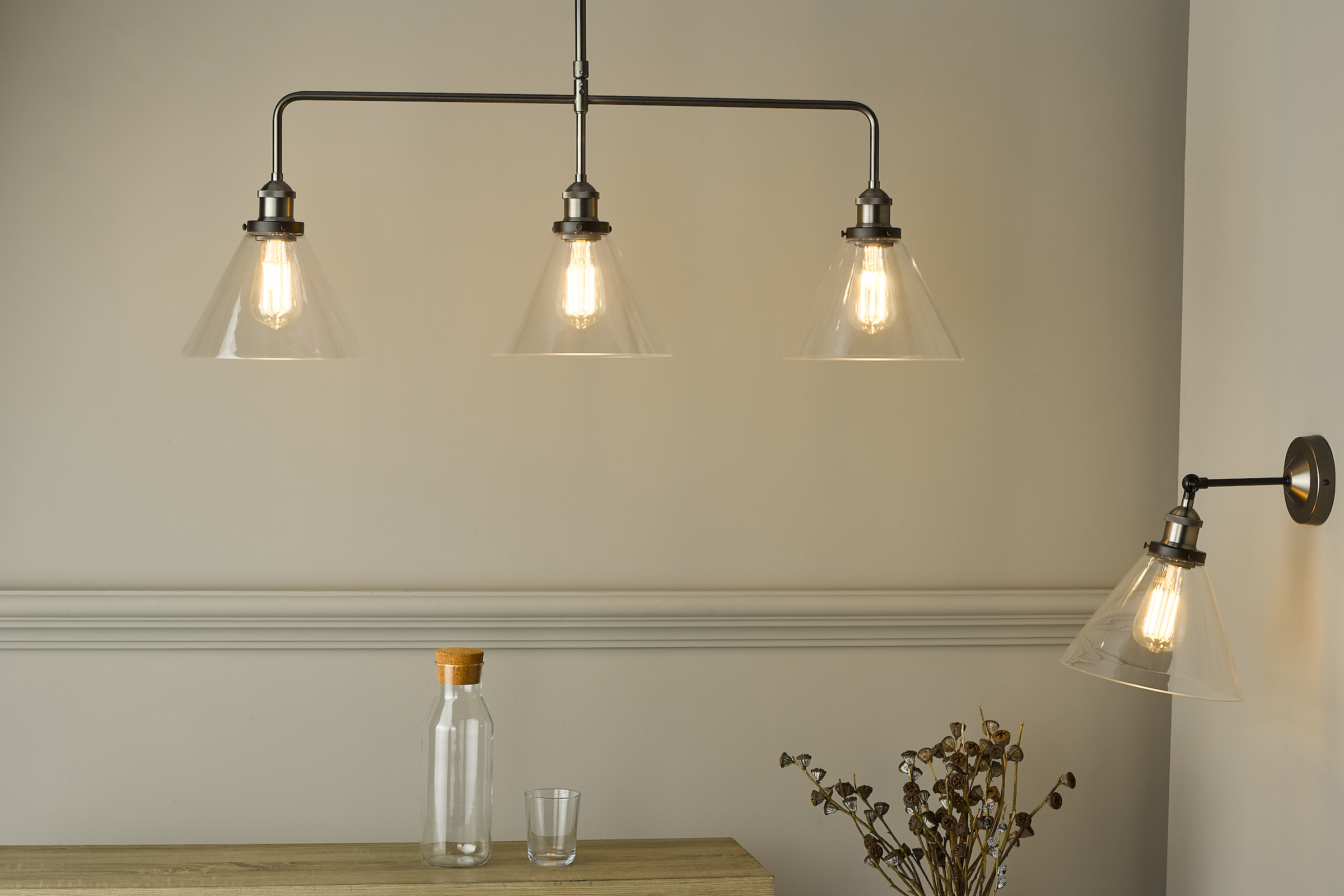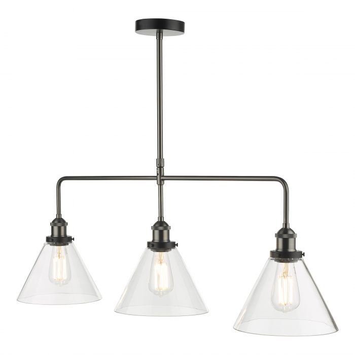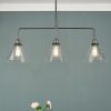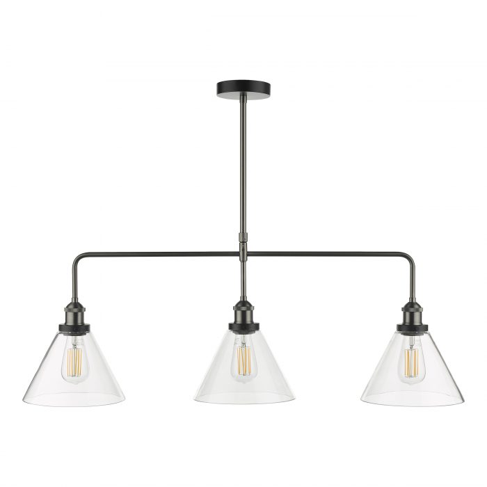 A 3 light bar pendant finished in either antique brass or antique nickel & glass shades.