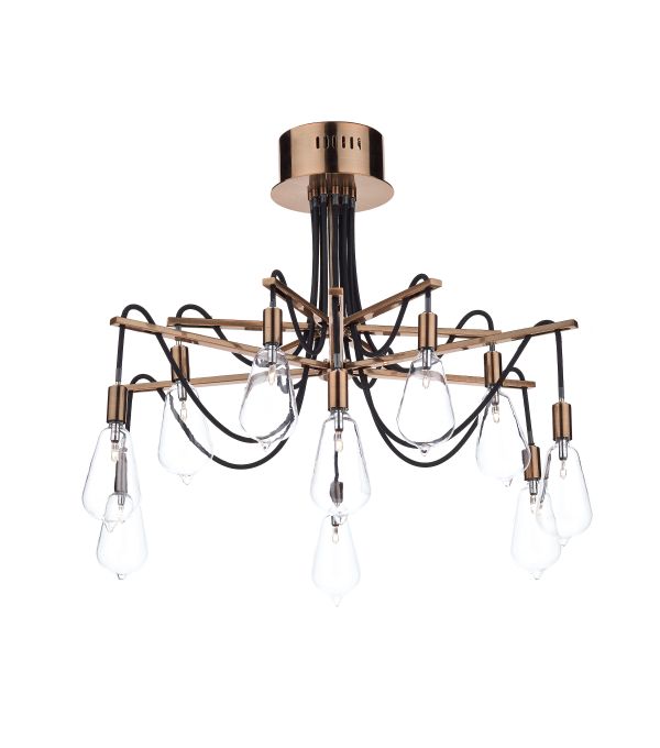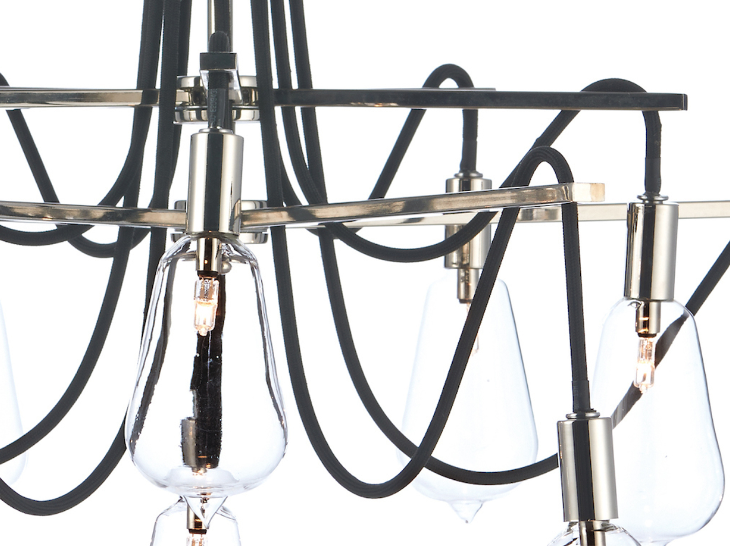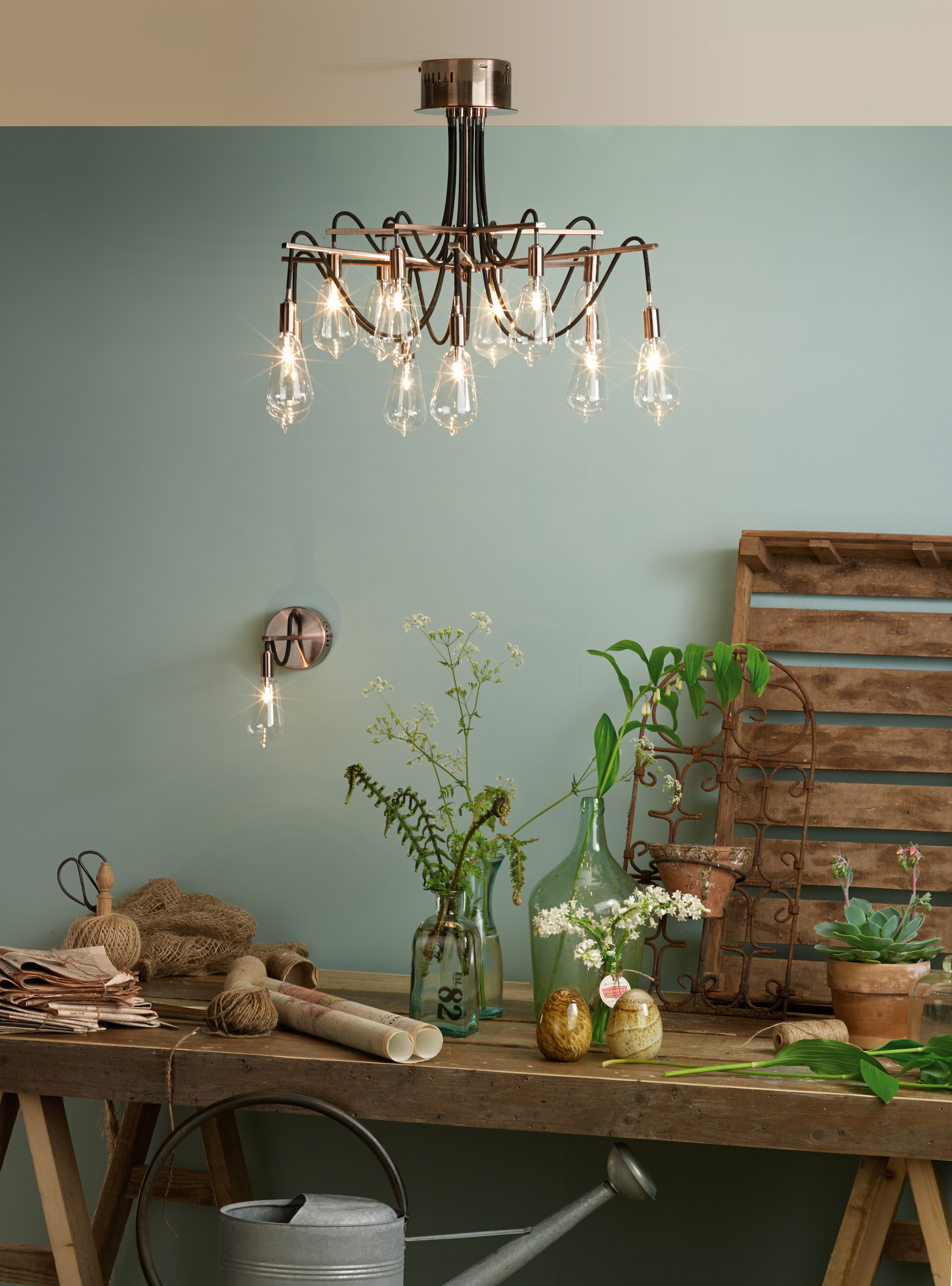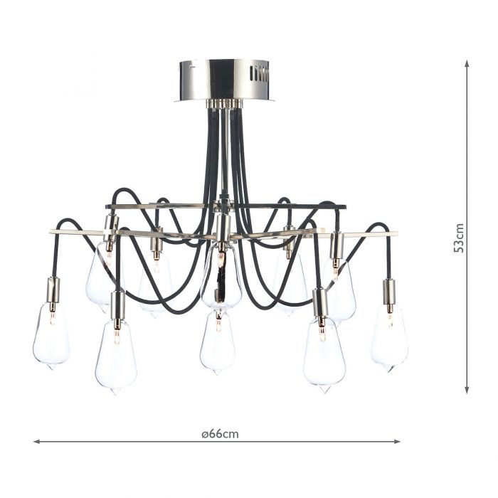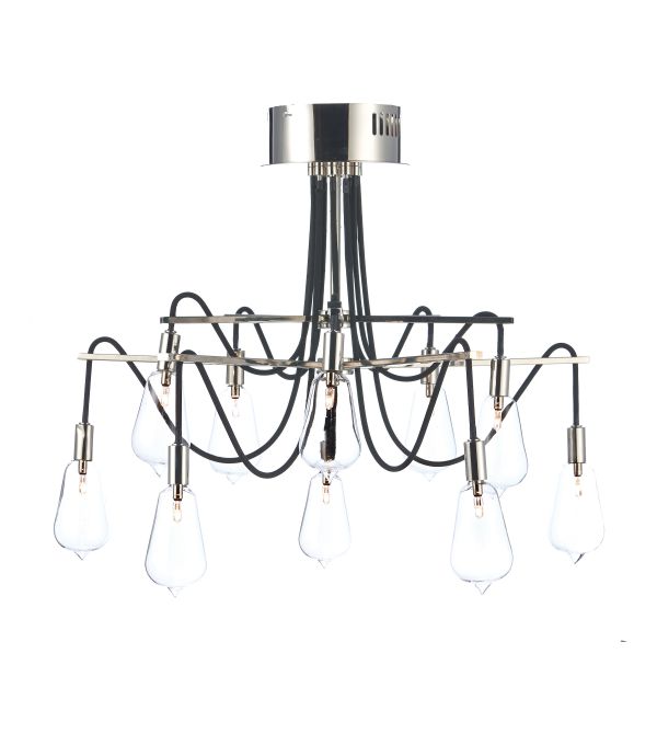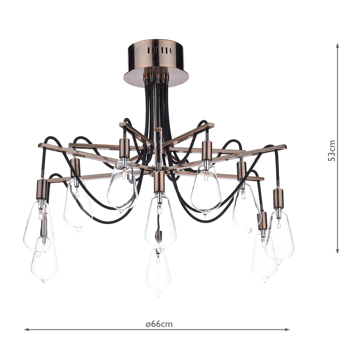 A 10 light semi flush light featuring either a copper or a polished nickel ceiling plate & frame. With black braided cable & G4 lamps set within a glass shade to give a vintage appearance.