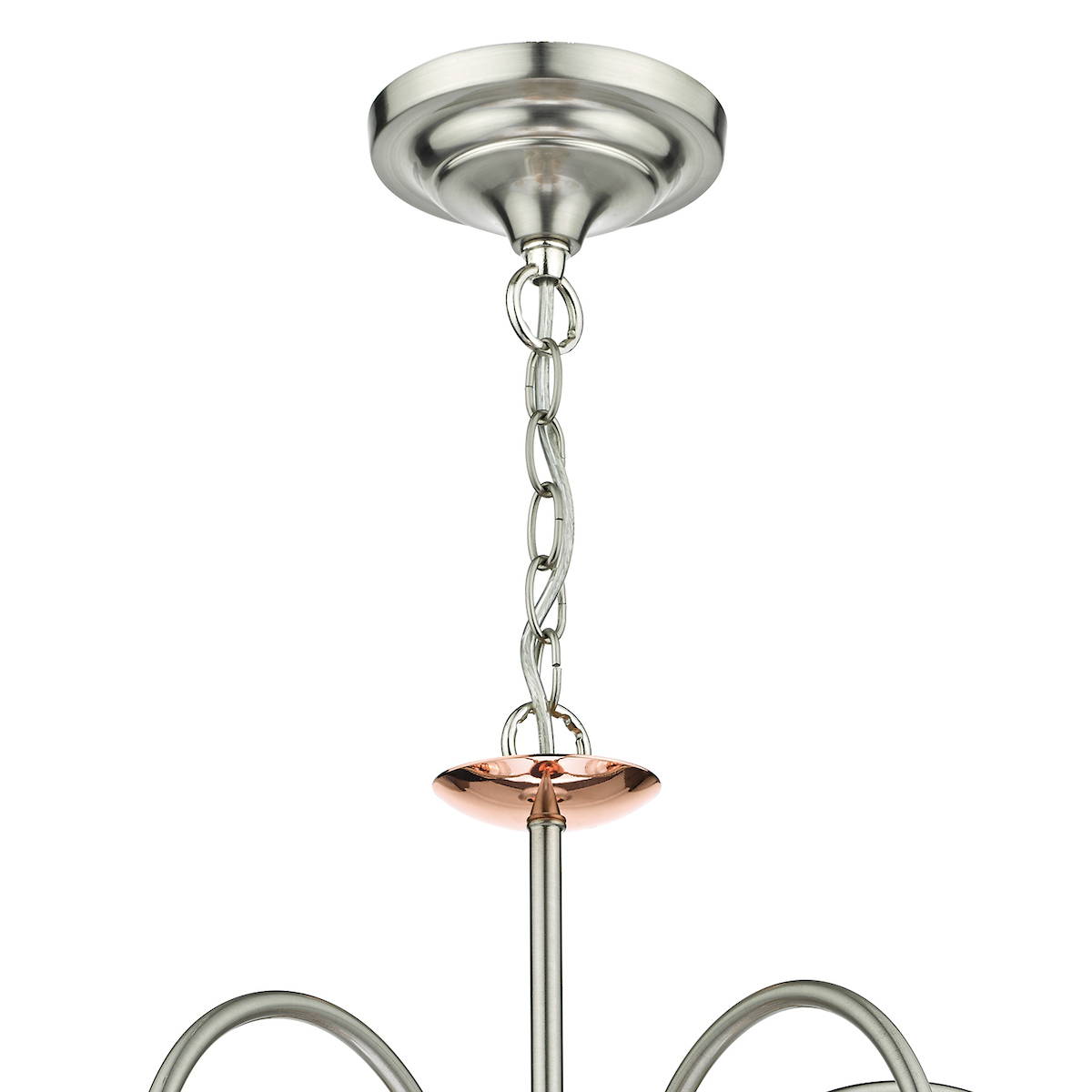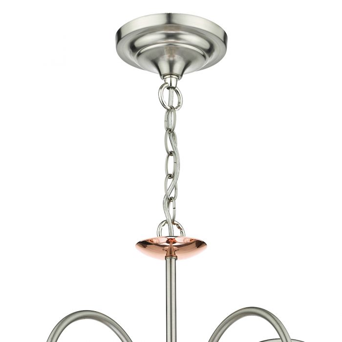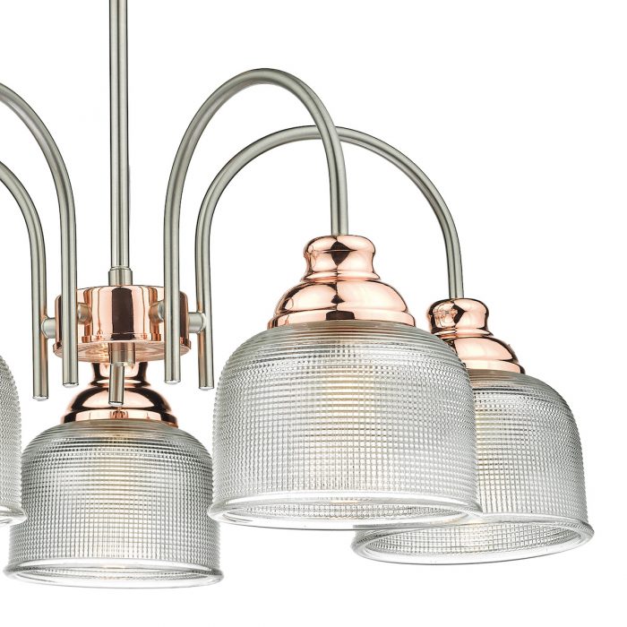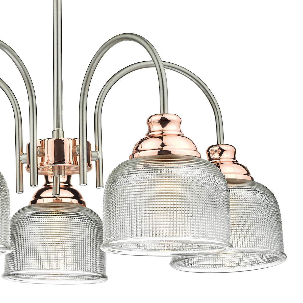 A vintage style glass shade teamed with soft satin chrome metal work and bright copper detailing.