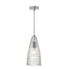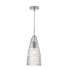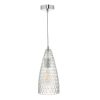 A 1 light pendant with a faceted glass disc surrounded by a polished chrome cage.