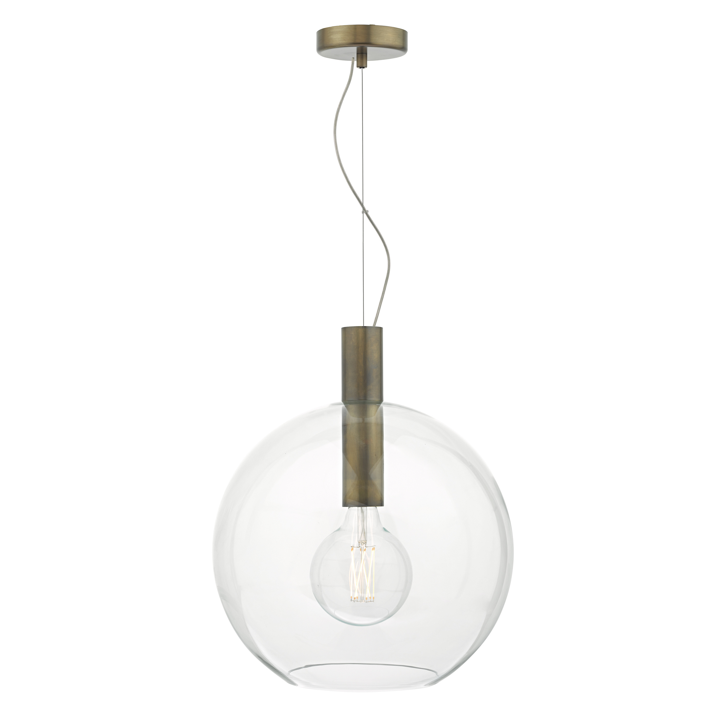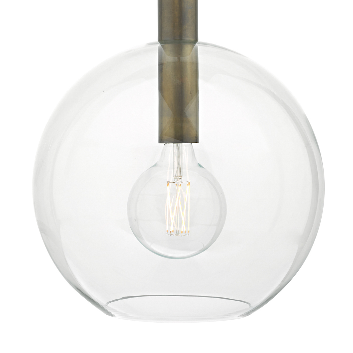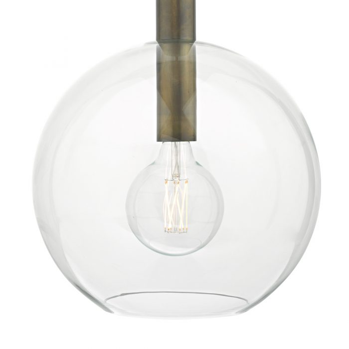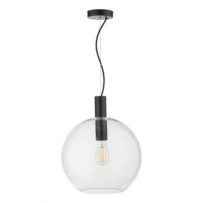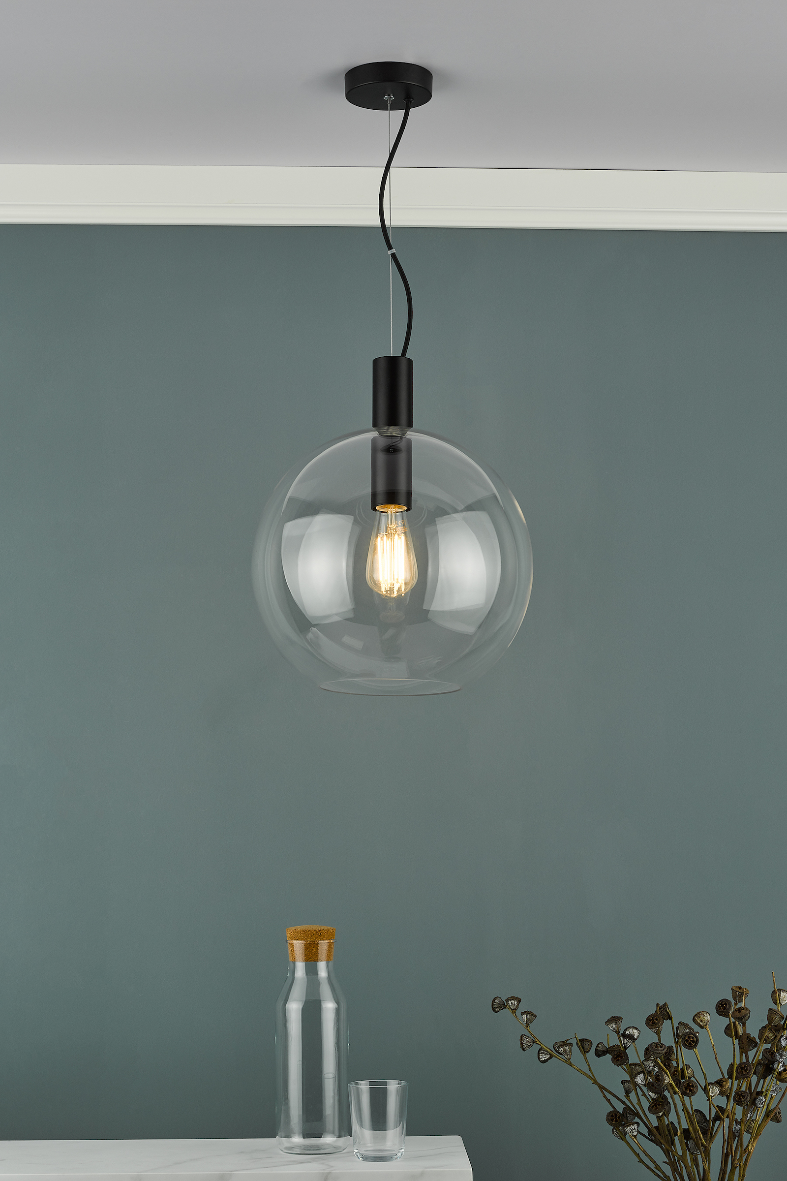 This single pendant features a contemporary matt black tube intersecting a clear glass sphere.